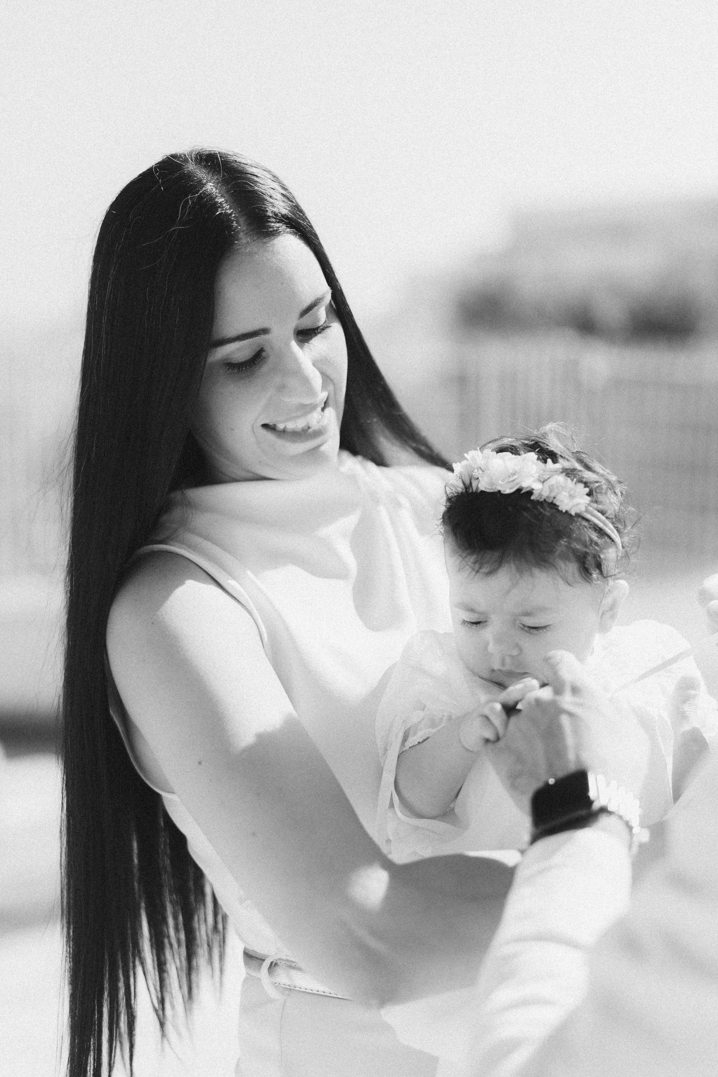 A woman holding a baby girl outdoors, both looking at the baby, with the woman smiling softly. The baby wears a floral headband and appears to be examining her hand. The image is in black and white.