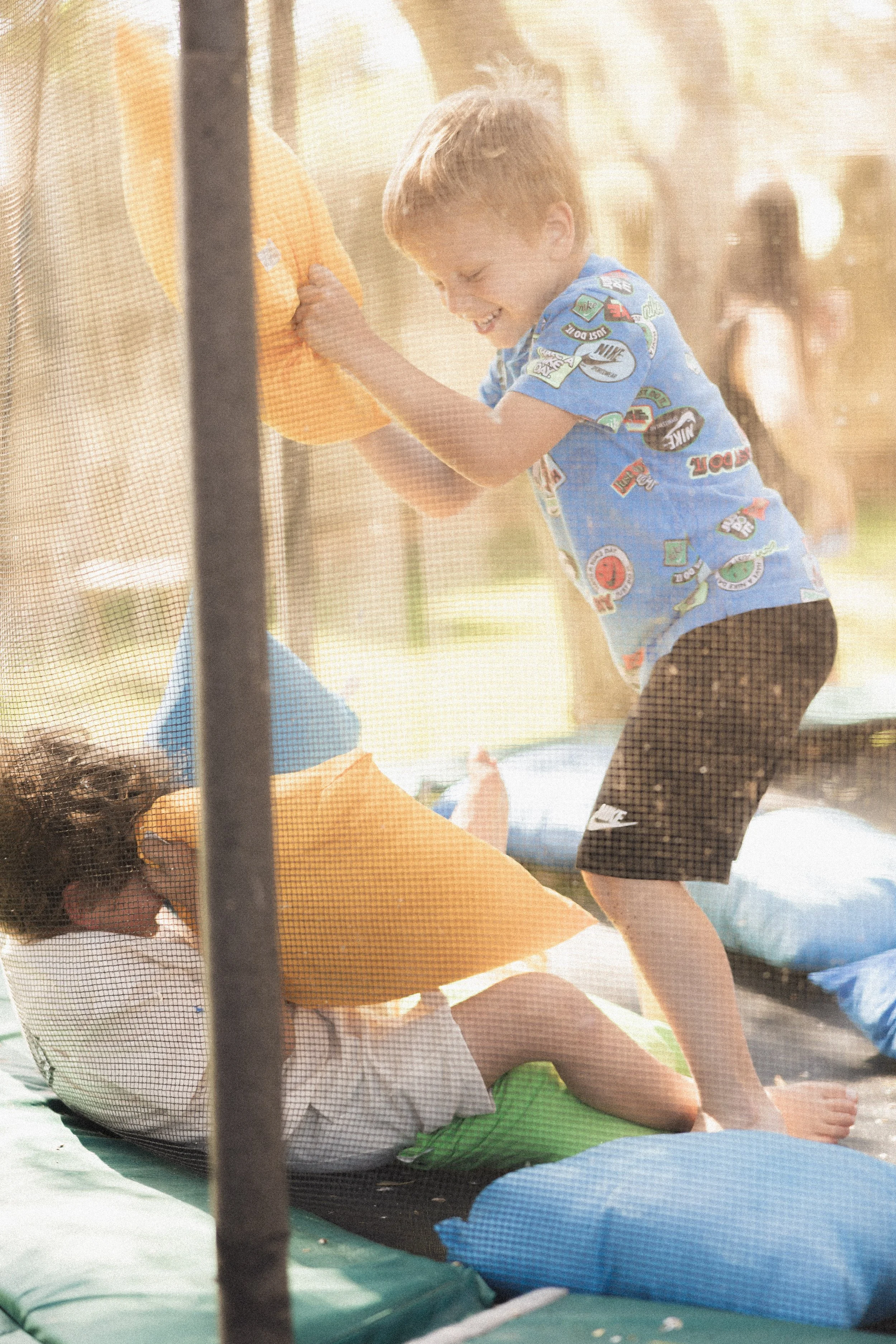 Children playing and jumping on a blanket with pillows in a backyard, with trees and adults in the background, during daytime.
