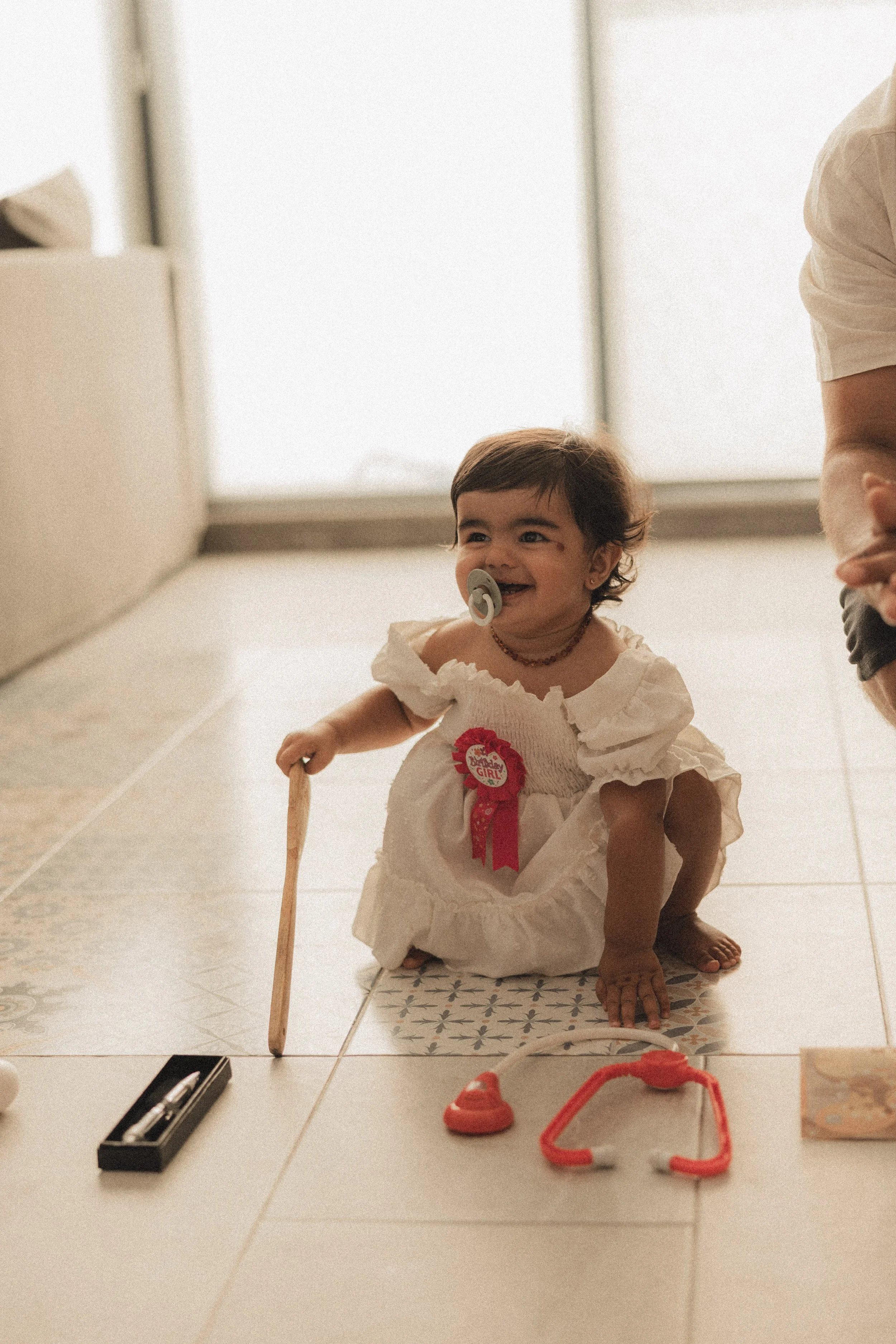 A young girl with short dark hair, wearing a white dress with a red ribbon badge that reads 'Birthday Girl,' squatting on a tiled floor, smiling with a pacifier in her mouth, holding a small wooden stick, surrounded by various objects including a med