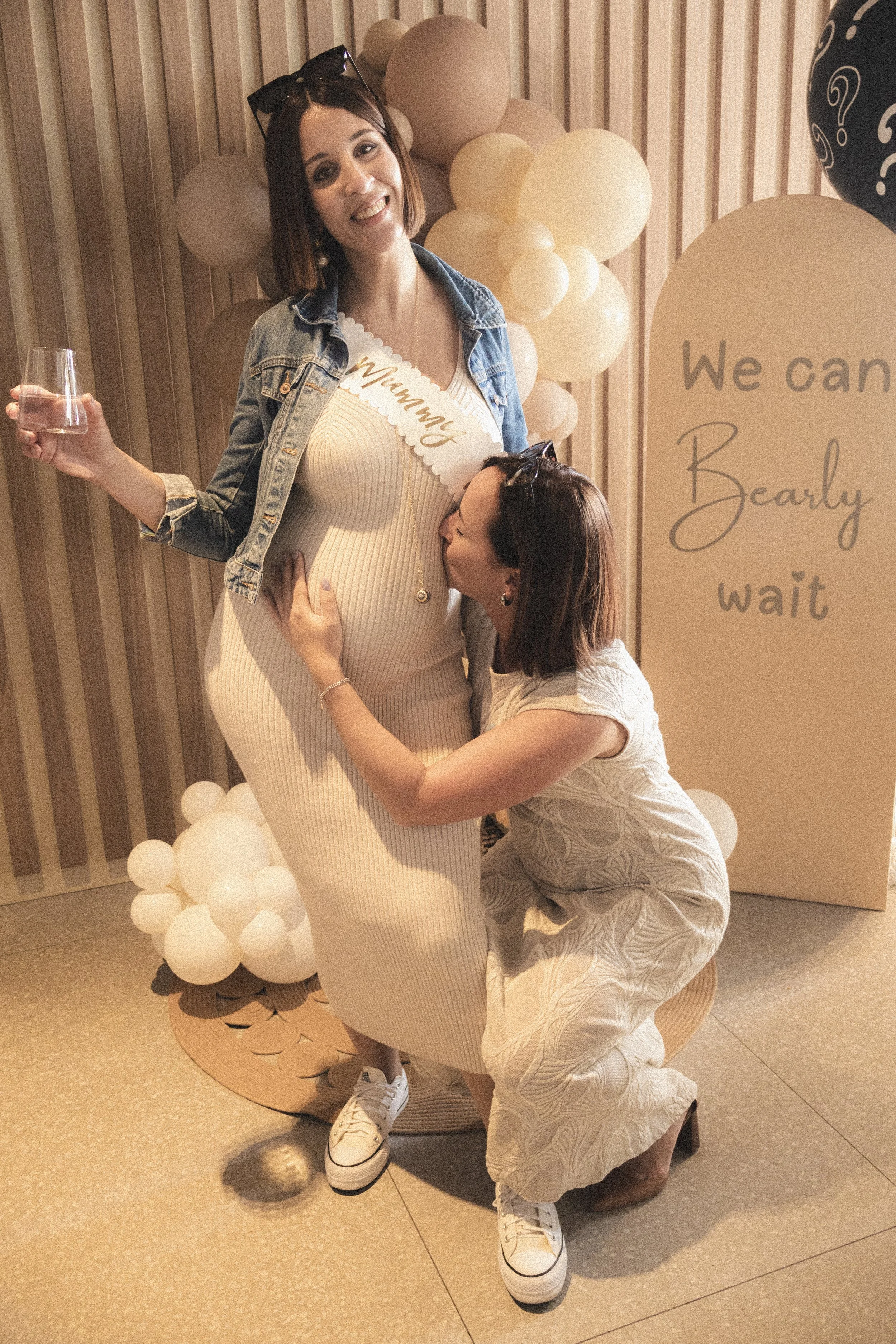 A woman in a beige dress with a 'Mummy' sash is smiling and holding a glass of drink, while another woman kneels and kisses her pregnant belly. They are standing in front of balloons and a sign that reads 'We can Bearly wait'.