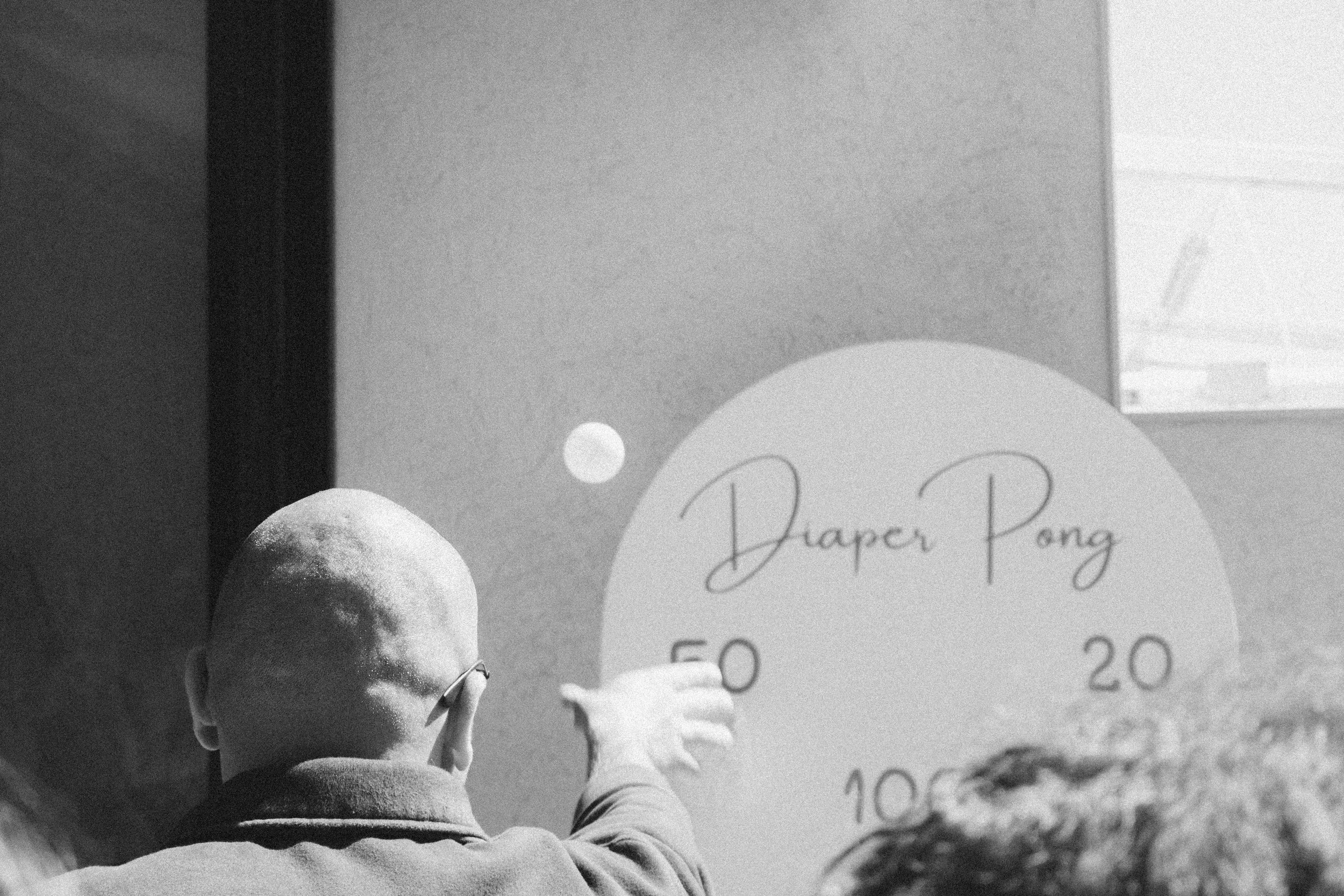 Person with glasses, viewed from behind, points at a large circular sign that says 'Diaper Pong' with the number 20 and some other text, in black and white. View fullsize