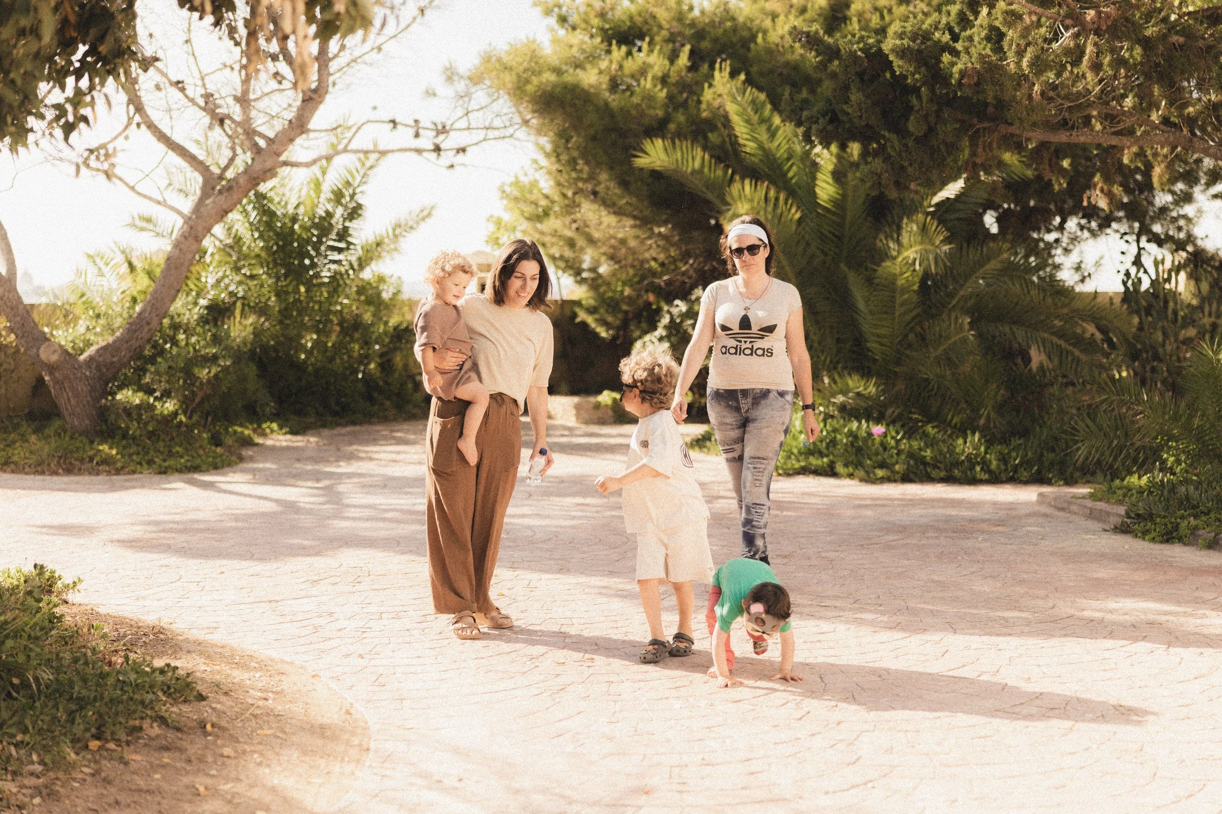 A woman in sunglasses walking with two children and another woman, holding a young child, as they walk on a paved path surrounded by trees and greenery on a sunny day.