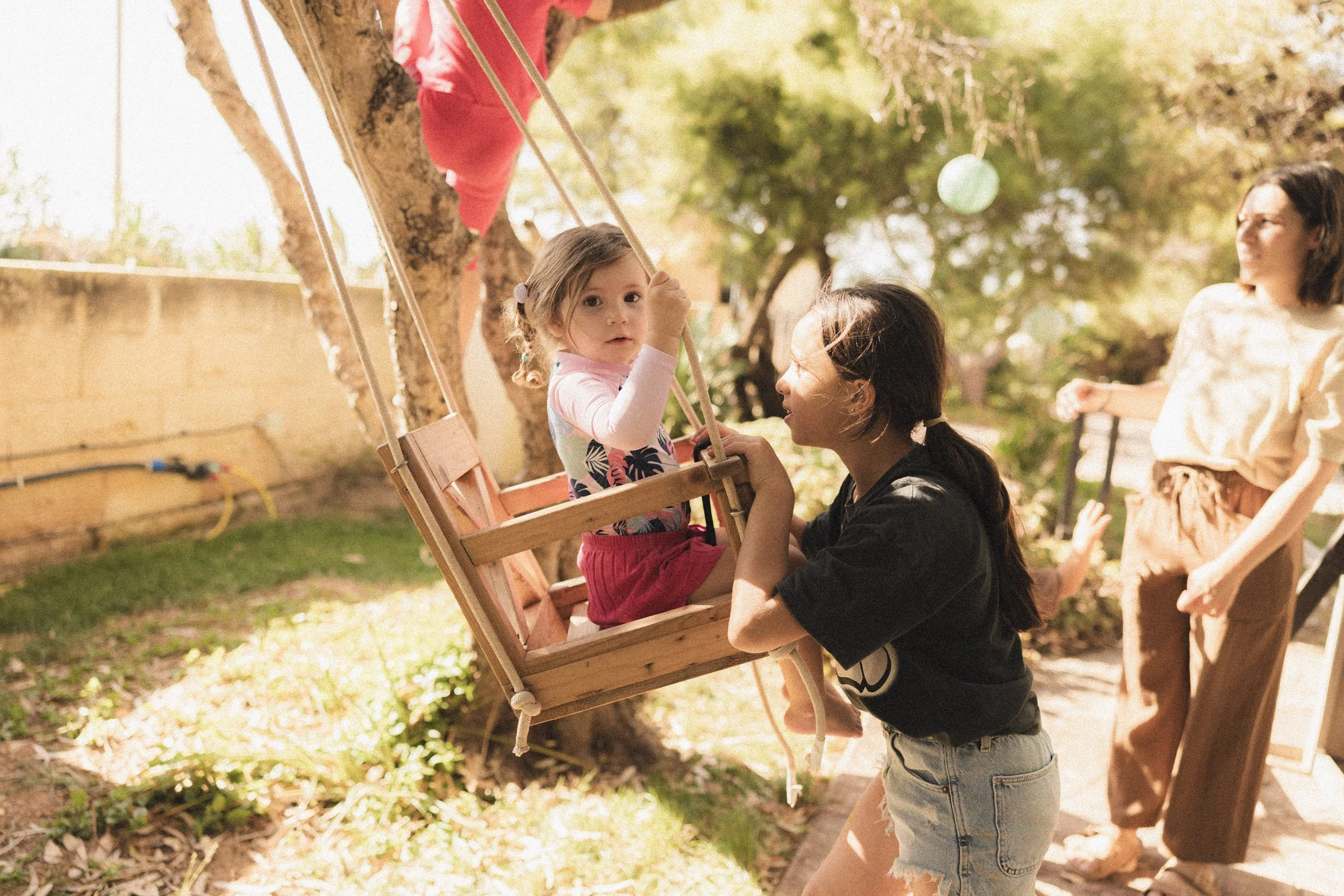 A young girl is sitting on a wooden swing, holding the ropes, while an adult woman pushes her in a yard with trees and sunlight. In the background, another woman stands near a table.