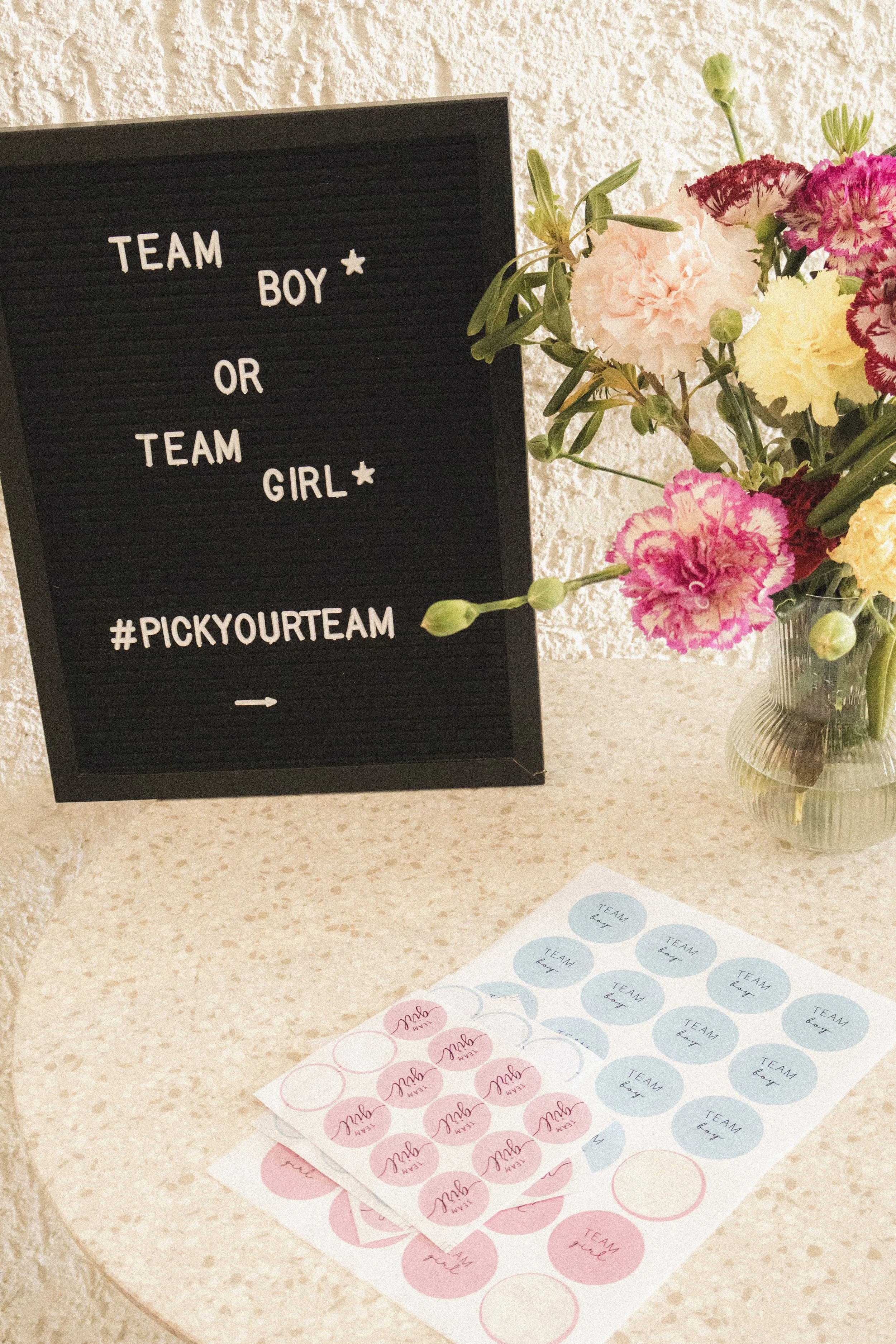 A black letter board with white letters, a small arrow, and a hashtag #PICKYOURTEAM next to a glass vase of pink, yellow, and purple flowers, with sheets of stickers labeled 'Team Boy' and 'Team Girl' on the table. View fullsize