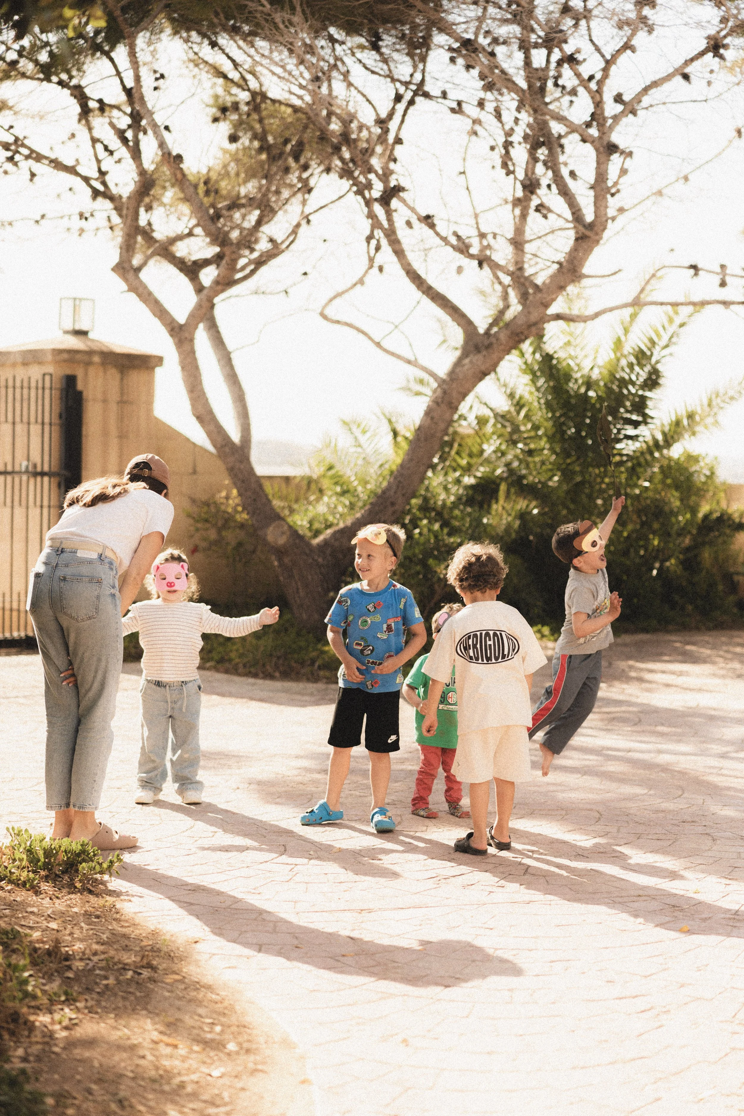 Group of children playing outside, with some wearing pig masks, on a sunny day near trees and a fence.