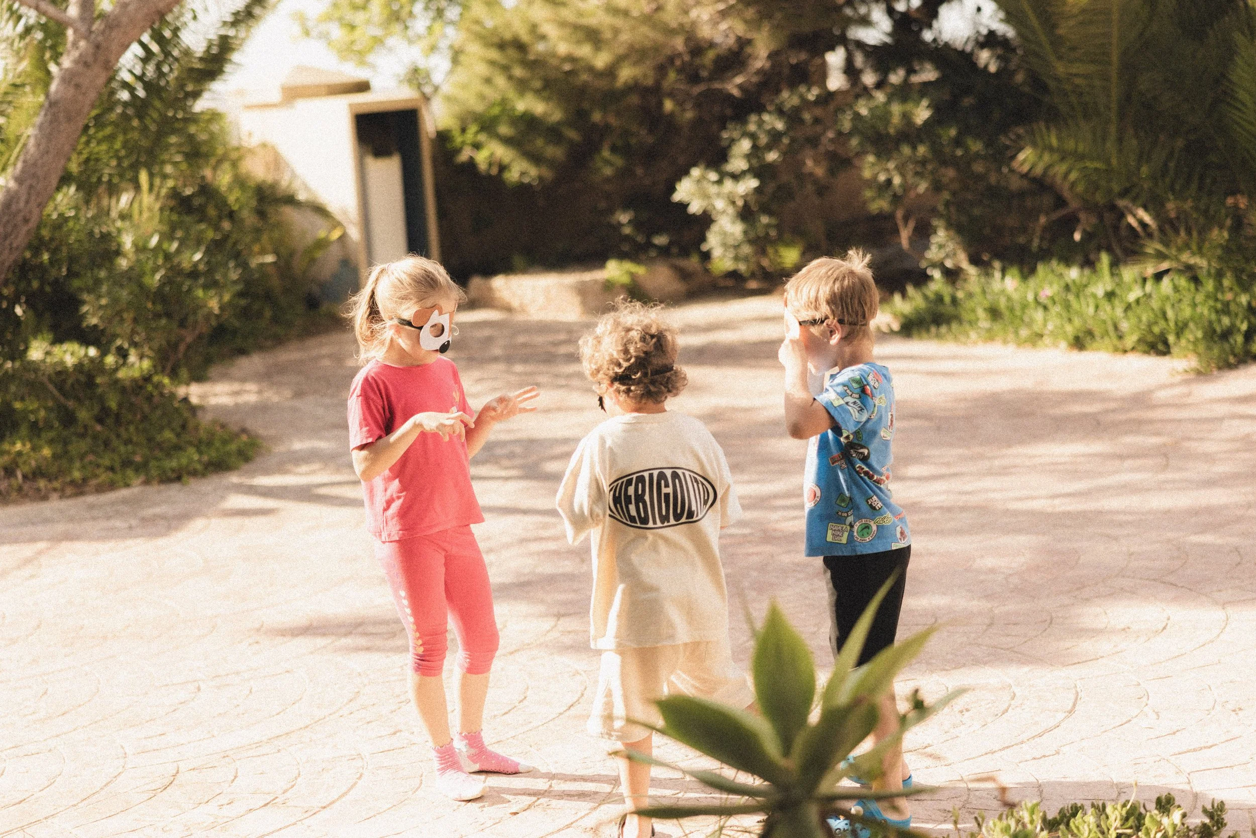 Three children wearing masks stand on a sunny outdoor patio, engaged in conversation, with lush greenery surrounding them.