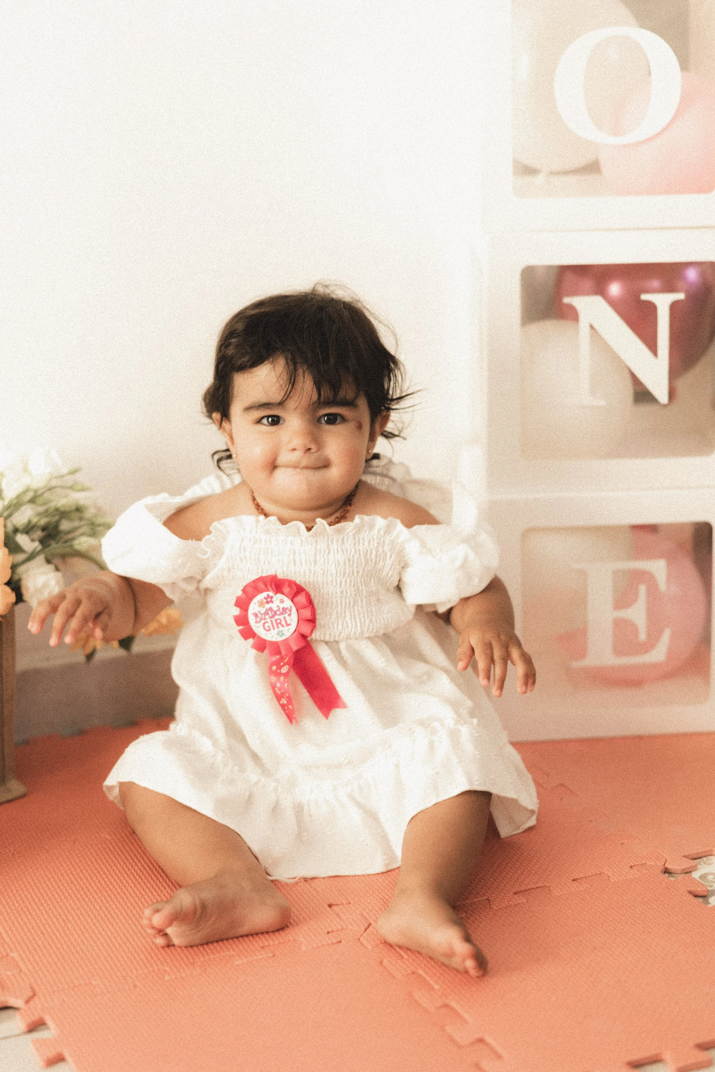 Baby girl sitting on pink foam mat, wearing a white dress with a pink and white