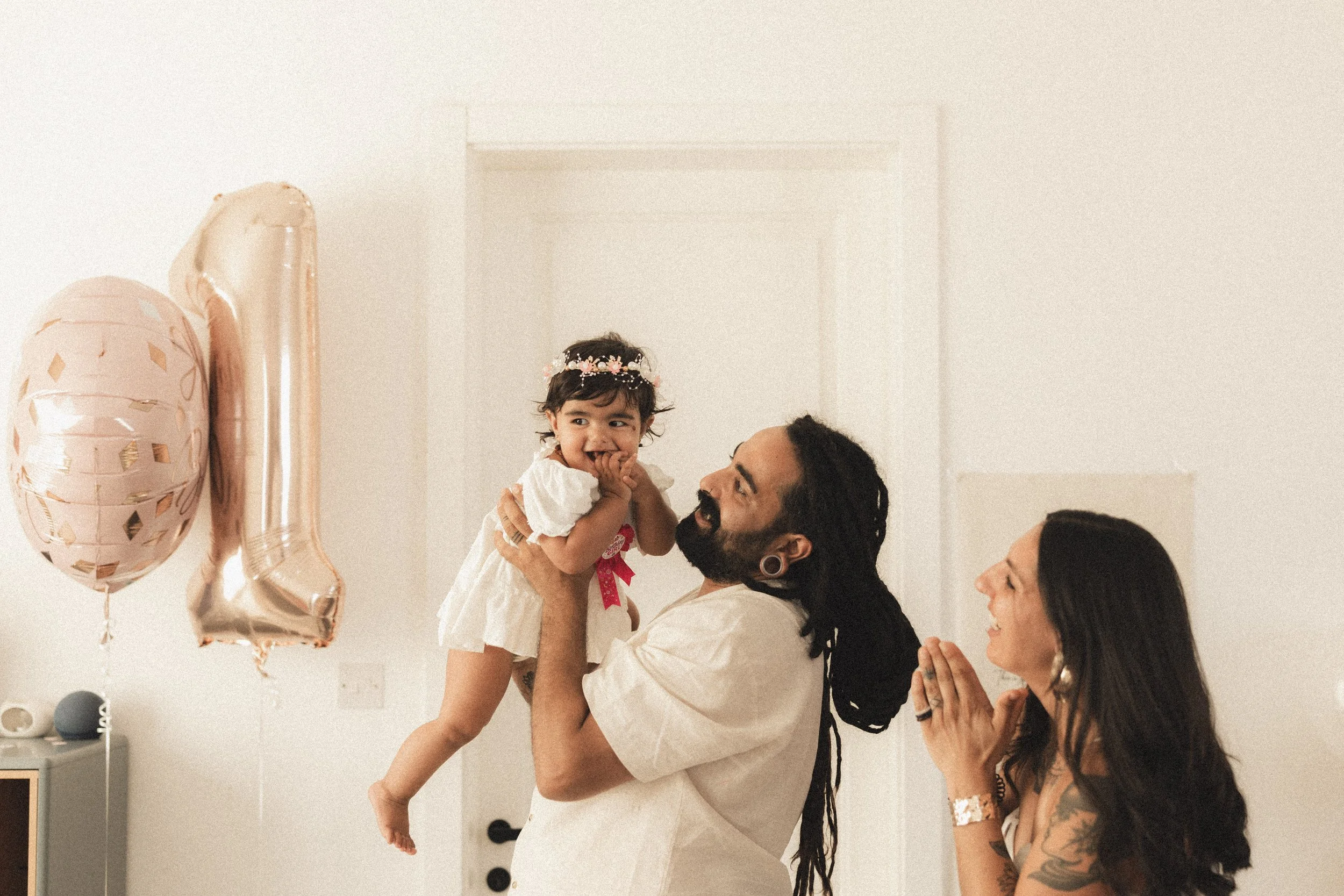 A man with long dreadlocks lifting a young girl wearing a white flower headband and dress at a celebration, with a woman clapping and celebrating nearby, in a room decorated with balloons including a large number one.