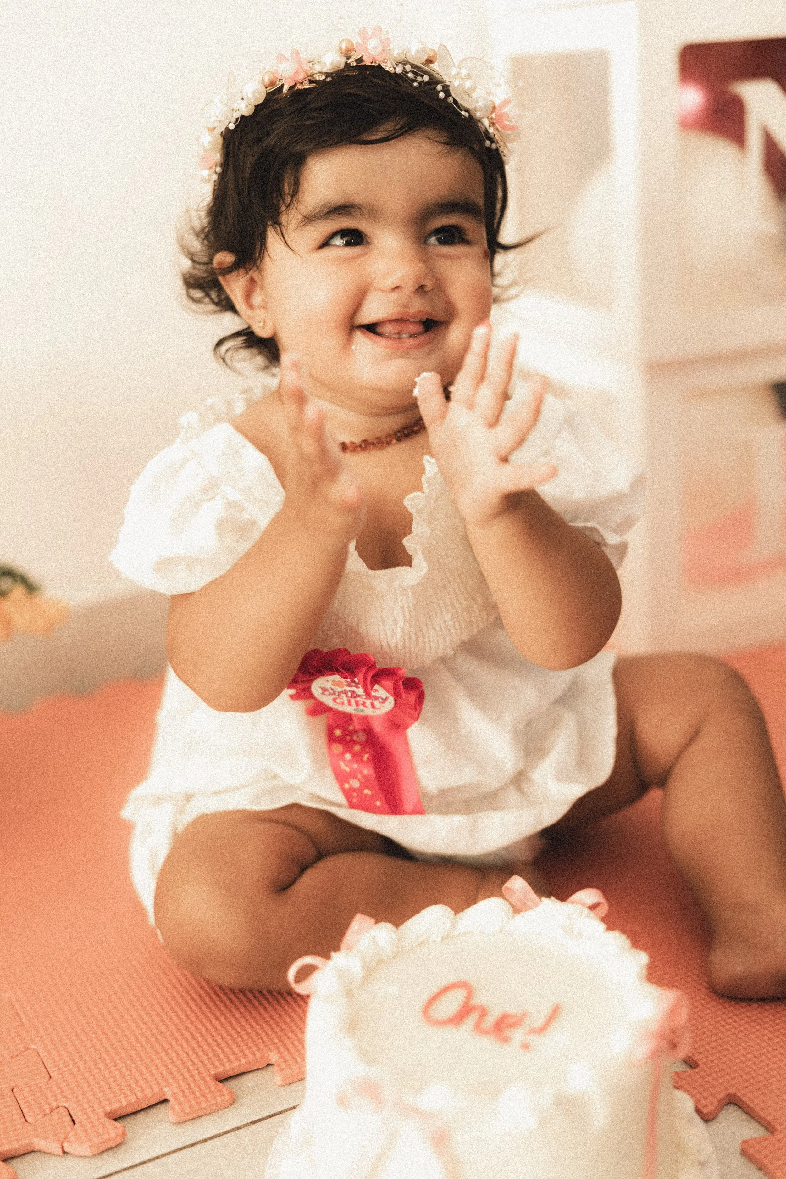 A young girl celebrating her first birthday, sitting on a pink foam mat, wearing a white dress with a pink 'One' badge, and a flower headband. There is a birthday cake with pink and white decorations in front of her, and she is smiling with her hands