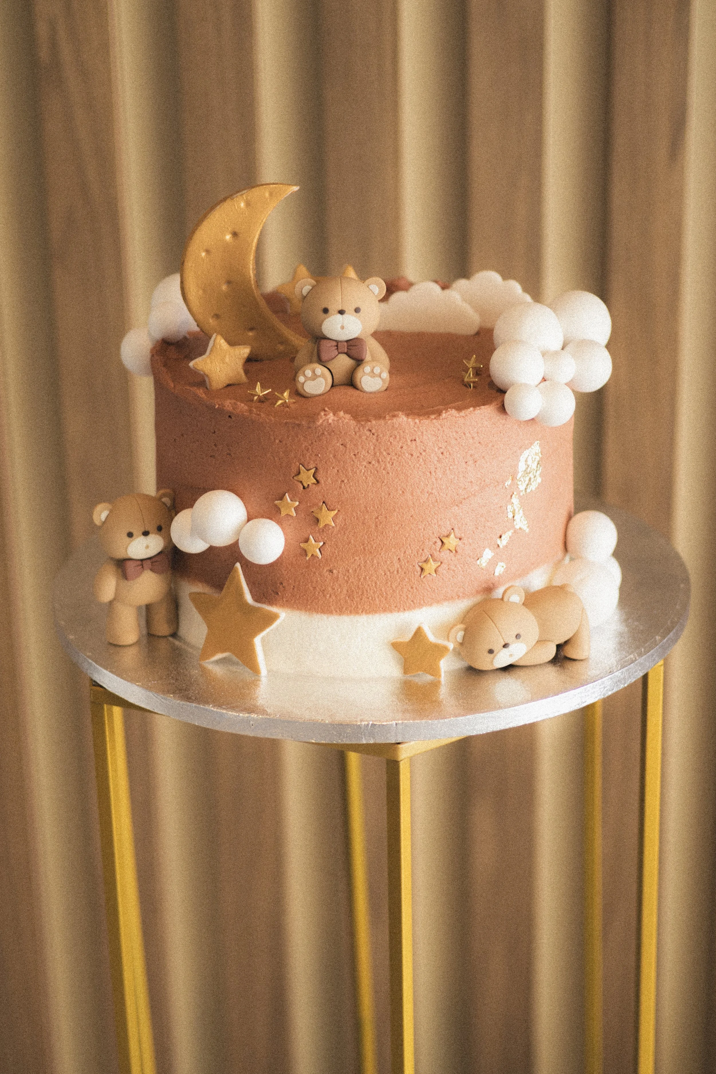 A decorated cake with teddy bear toppers, stars, and cloud decorations, set on a silver and yellow cake stand against a beige curtain background.