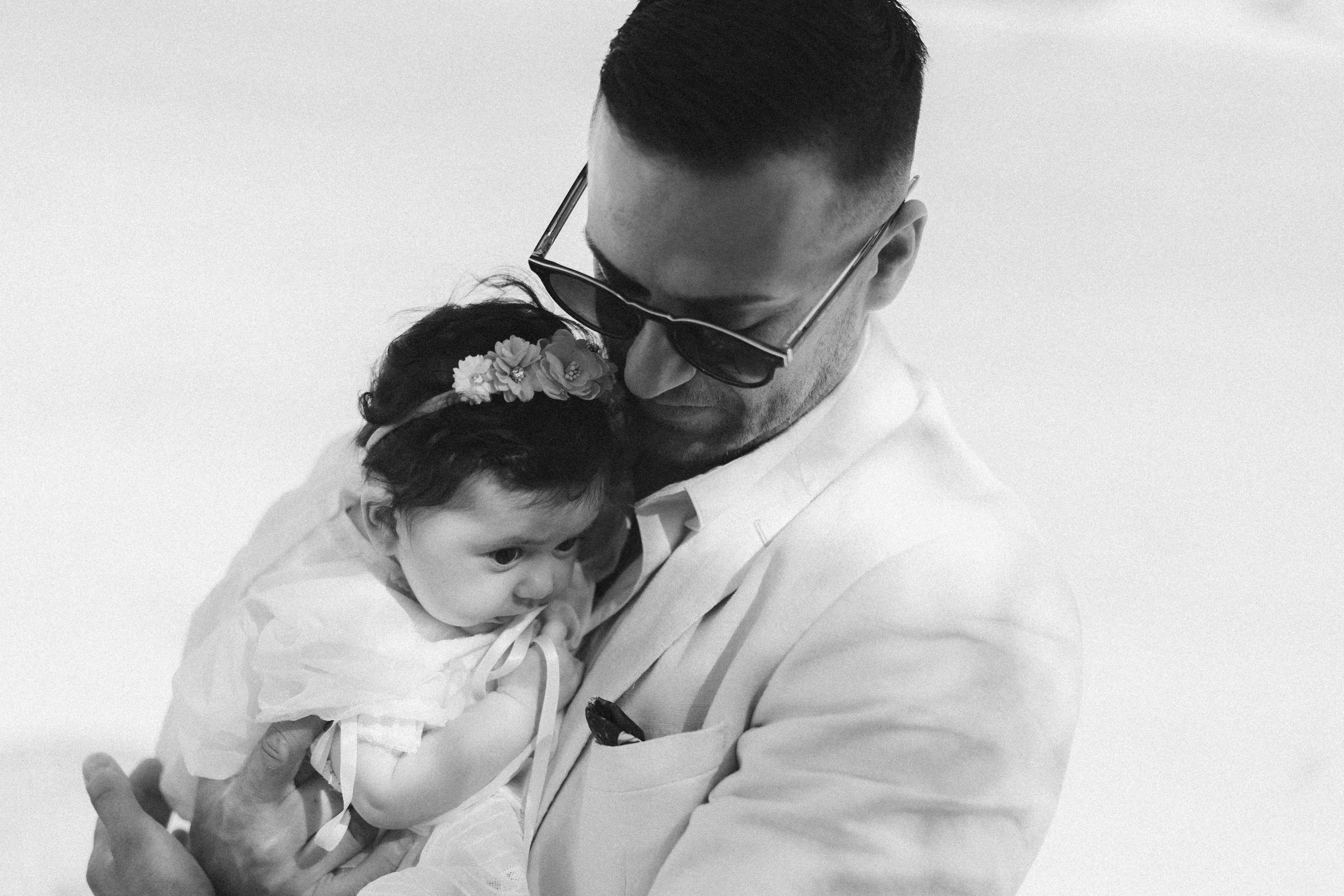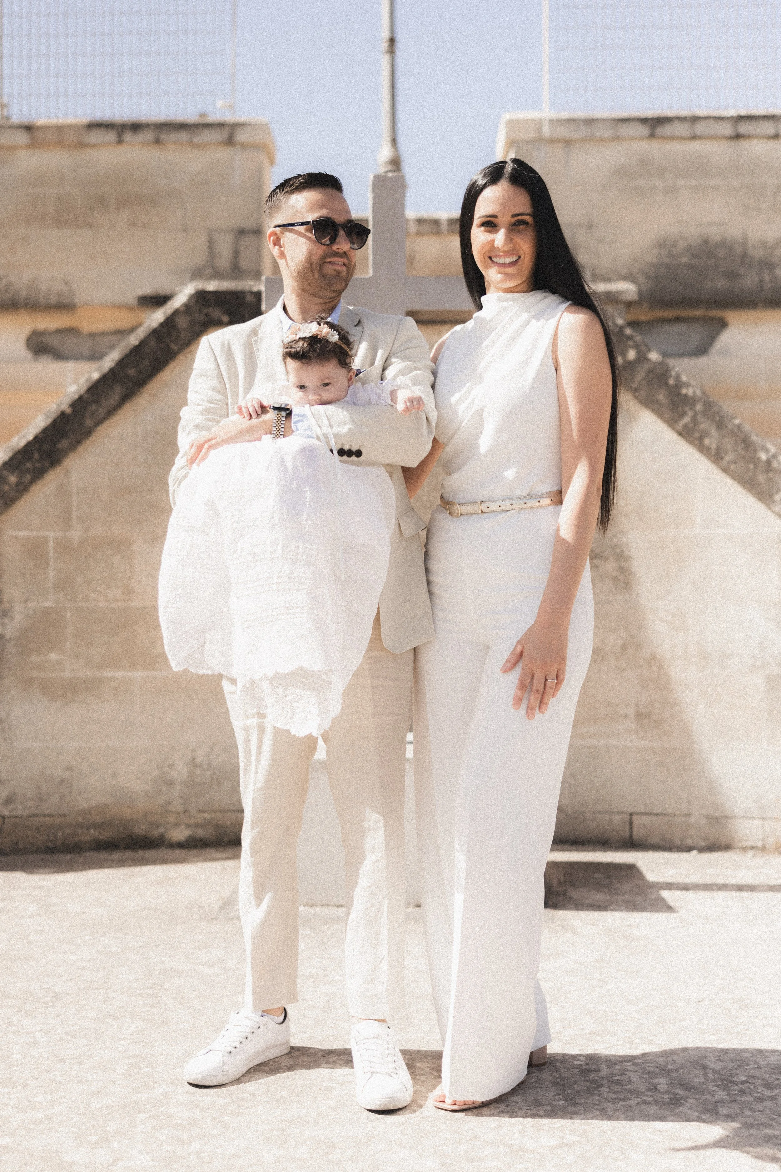 A happy family of three is standing outdoors, dressed in white clothes, with a beige stone background and steps behind them. The man is holding a baby girl, and a woman is standing beside them, all smiling.