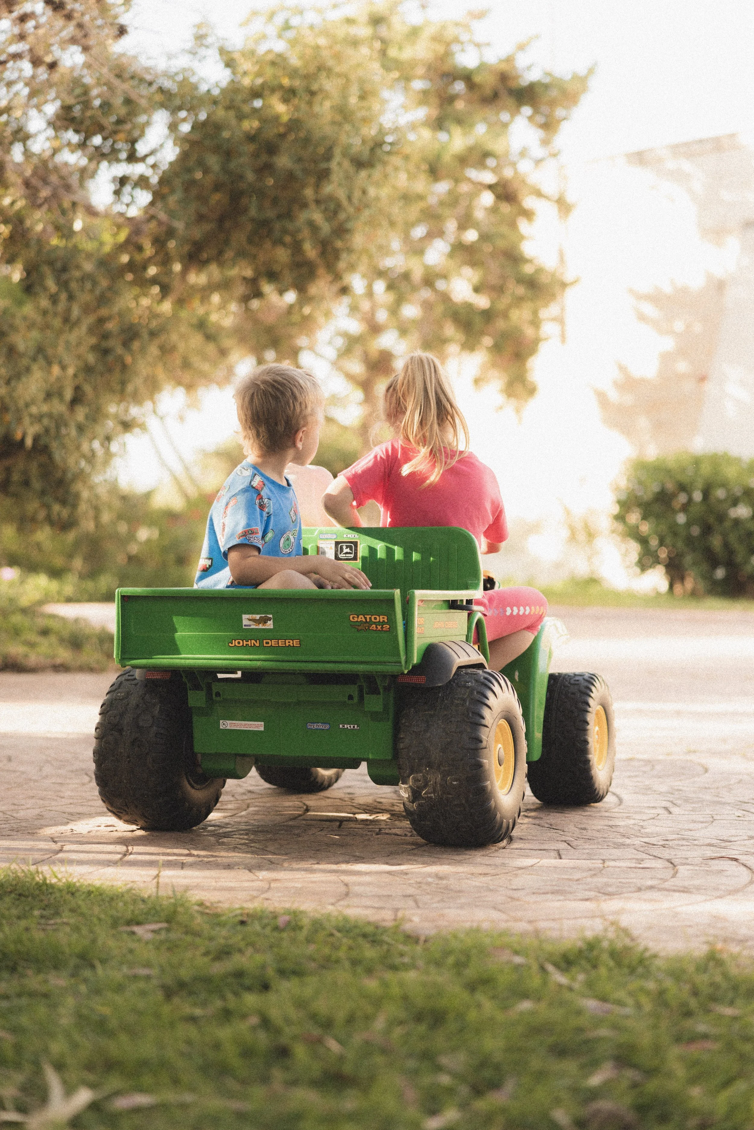 Two children riding in a green John Deere toy tractor outdoors on a bright day.