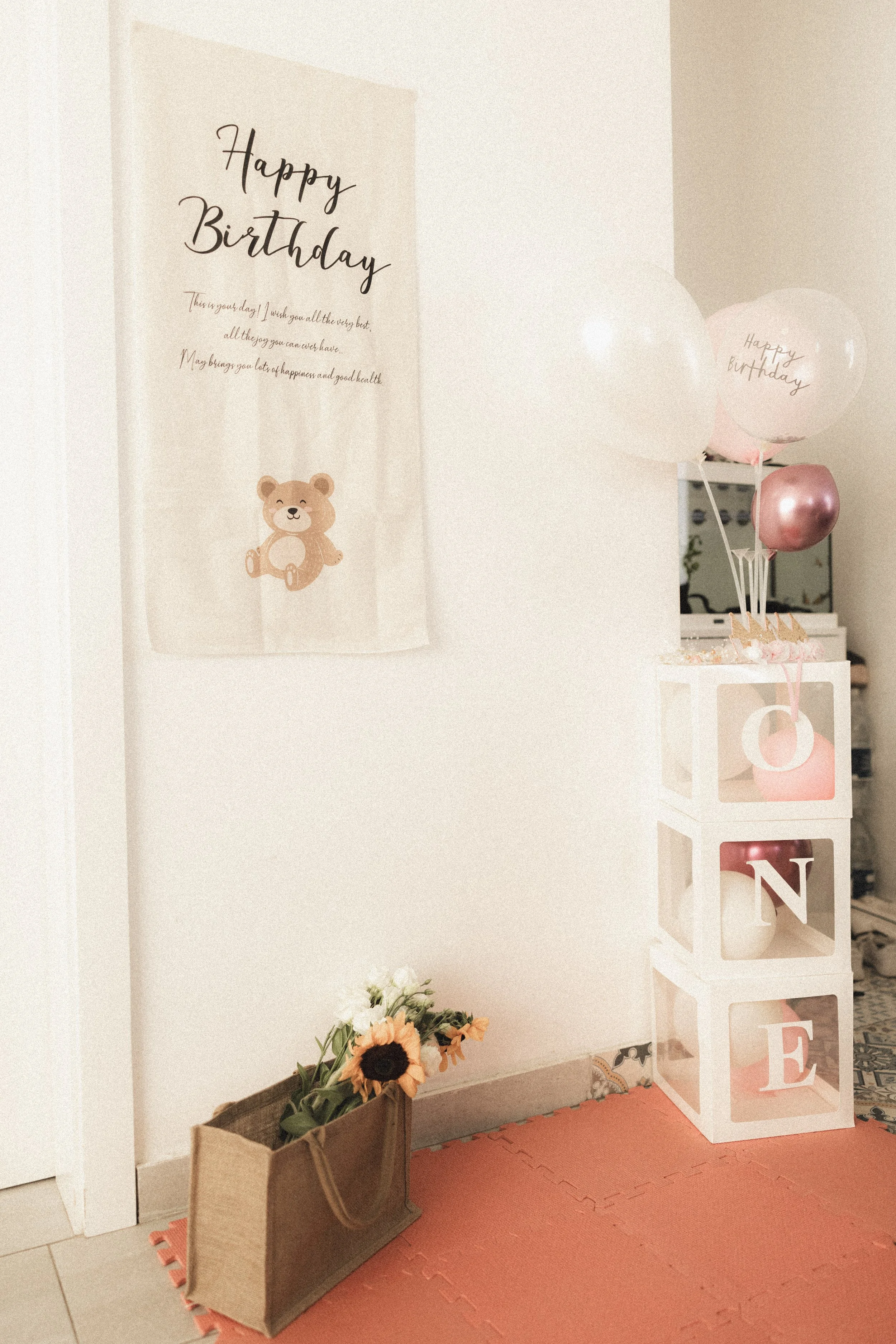 A corner of a room decorated for a birthday celebration with white and pink balloons, a banner, a flower arrangement, and a white cube shelf spelling out 'LOVE'.