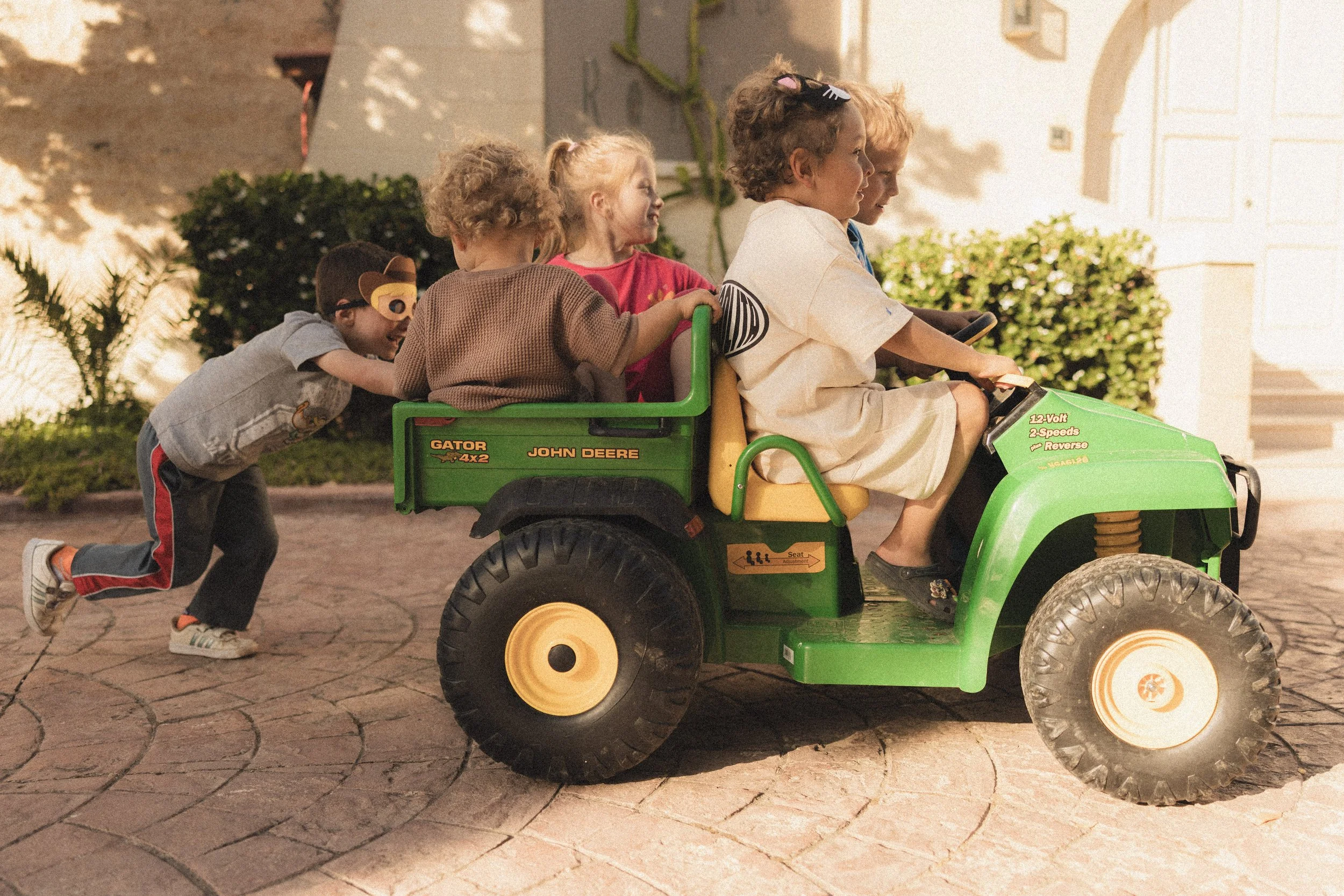 Four children playing with a toy John Deere Gator in a driveway, with one child driving and the others in the back seat, pushing.