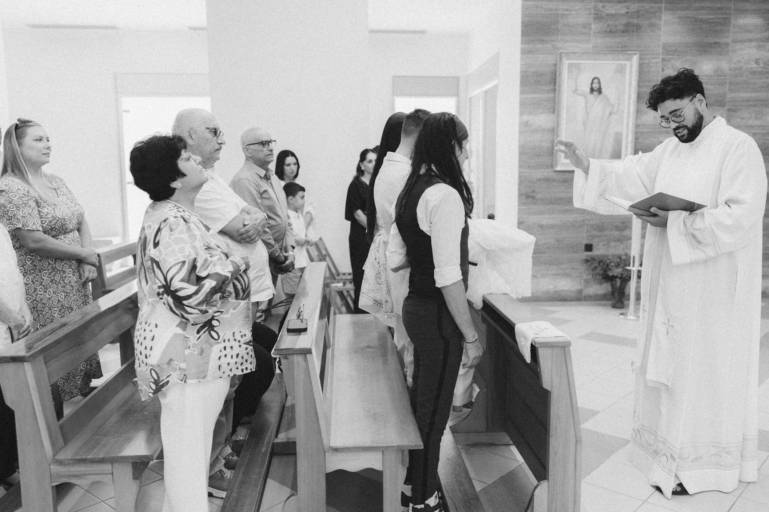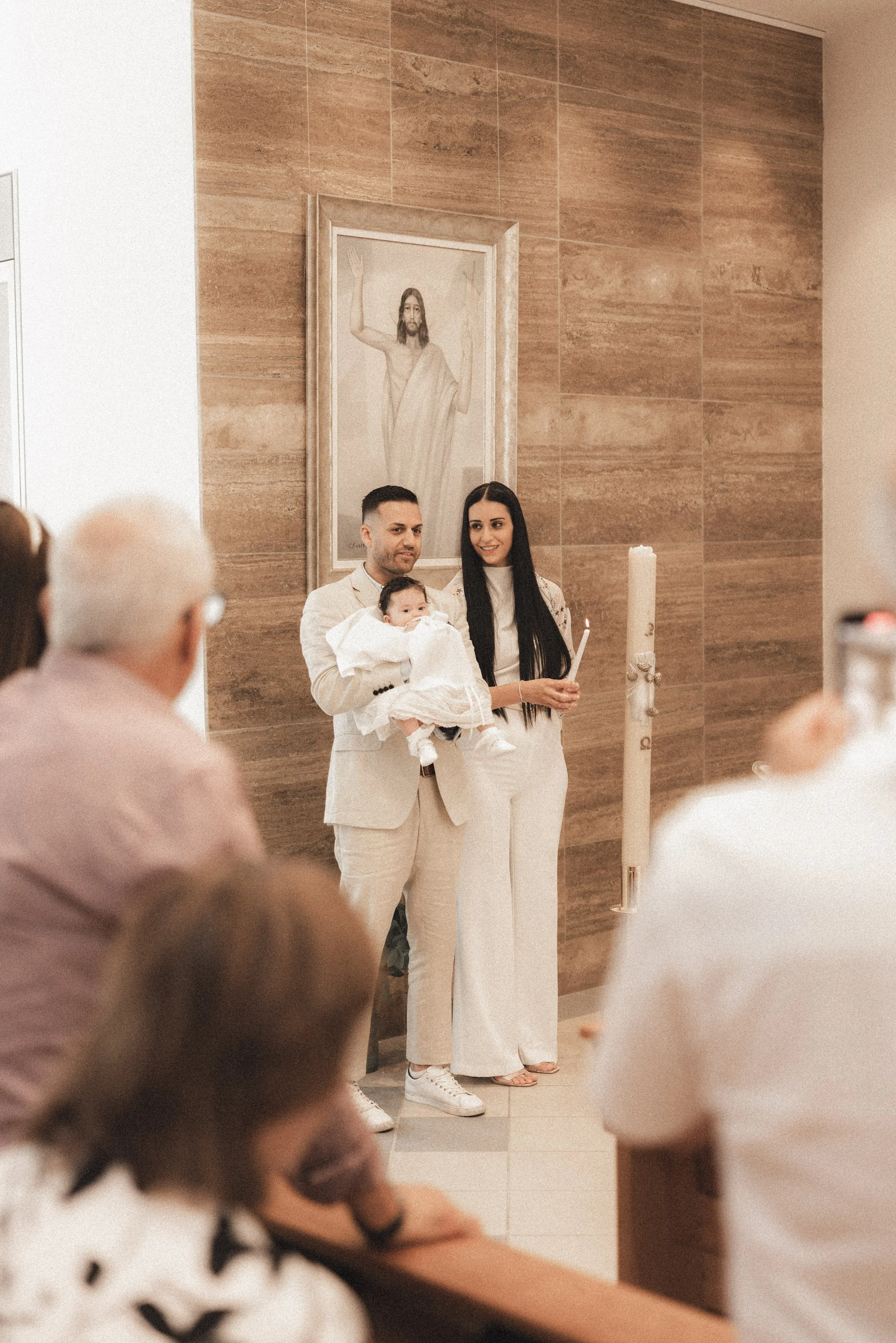 A family participating in a religious ceremony inside a church, with a priest depicted in a painting on the wall behind them. The man is holding a baby, and a woman is standing beside him, holding a lit candle.