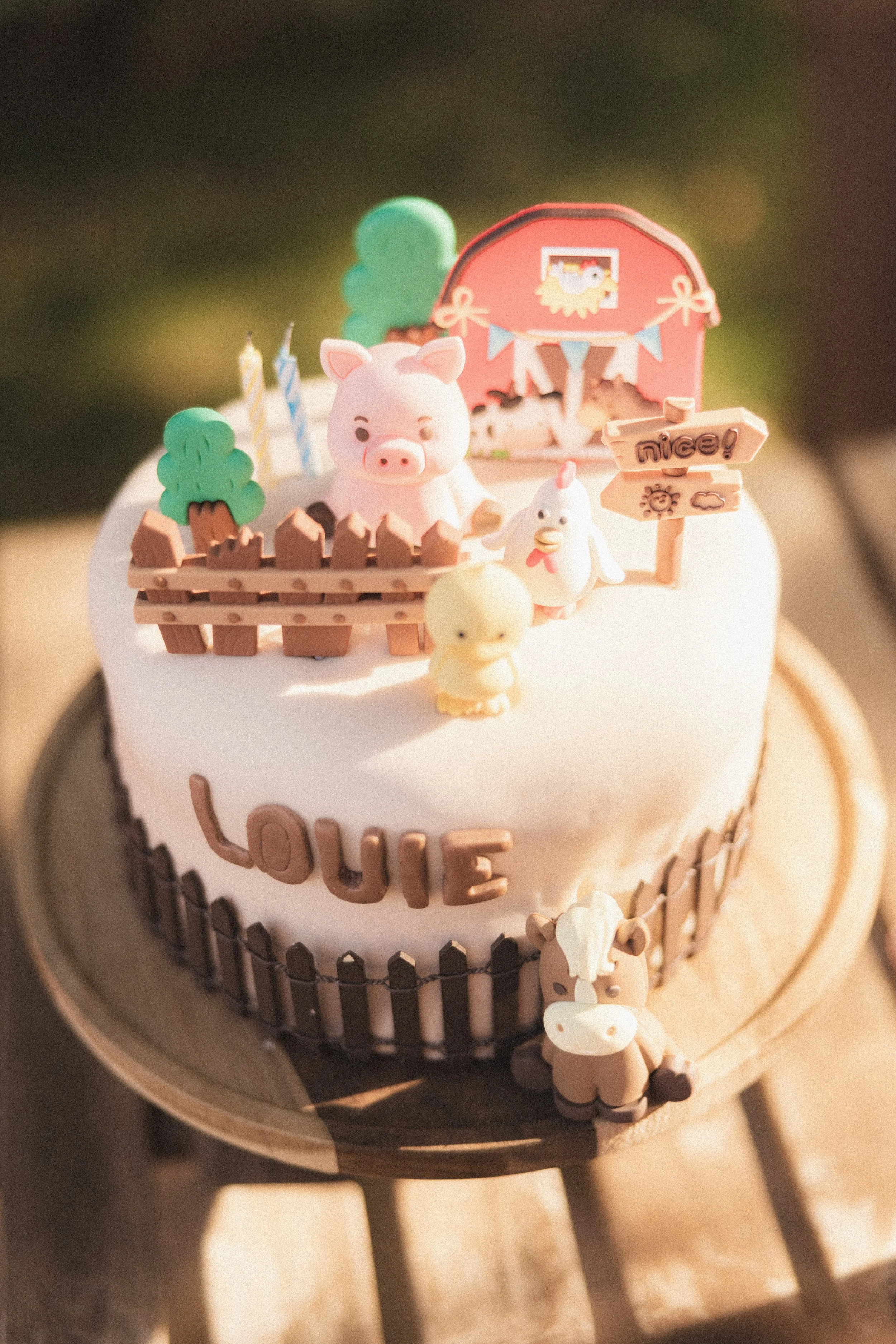 A birthday cake decorated with farm animal and barn-themed figurines including a pig, chicken, duck, horse, and duck welcome sign, with the name "Louie" on the side.
