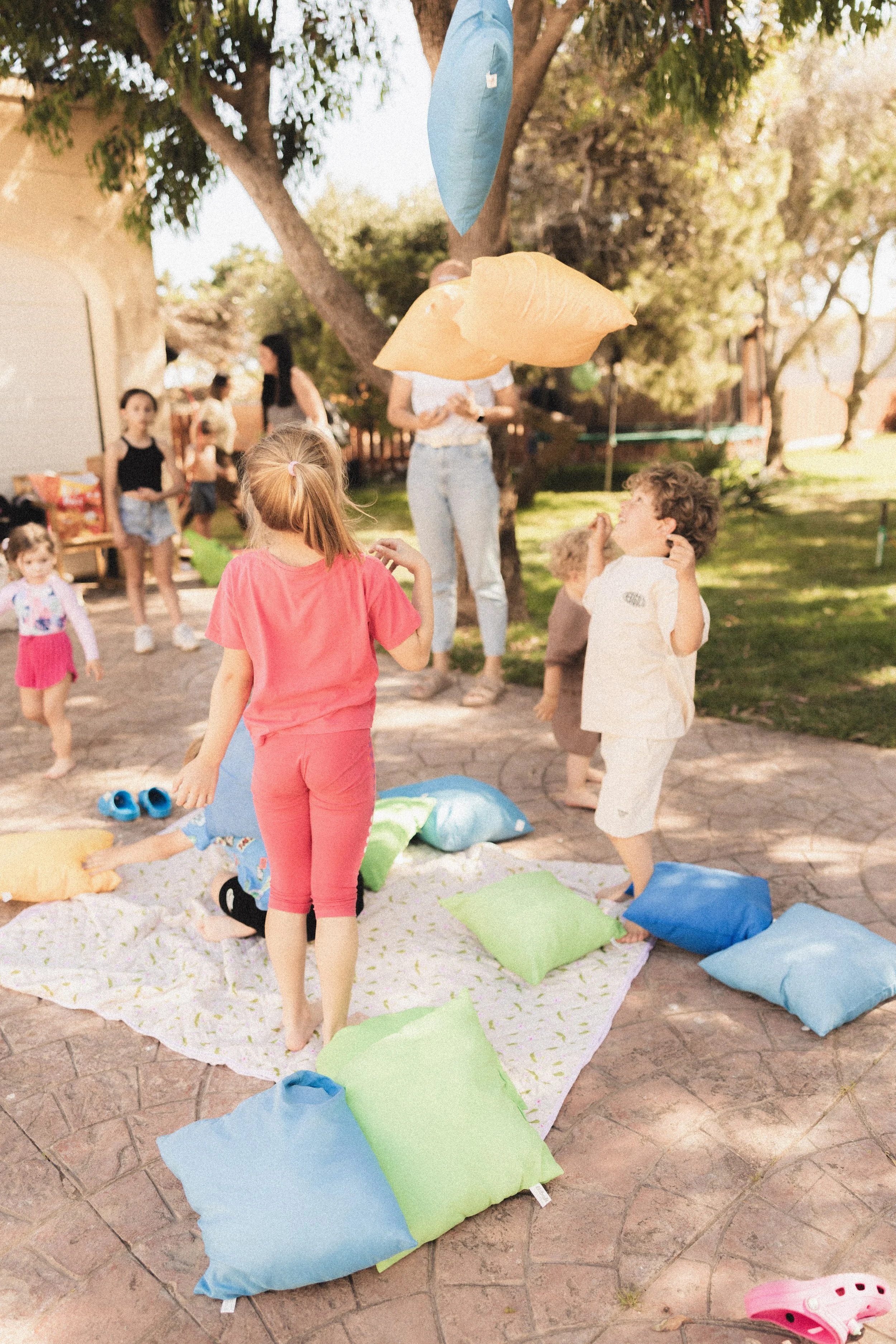Children playing wrestling on a blanket with pillows outdoors on a paved surface.