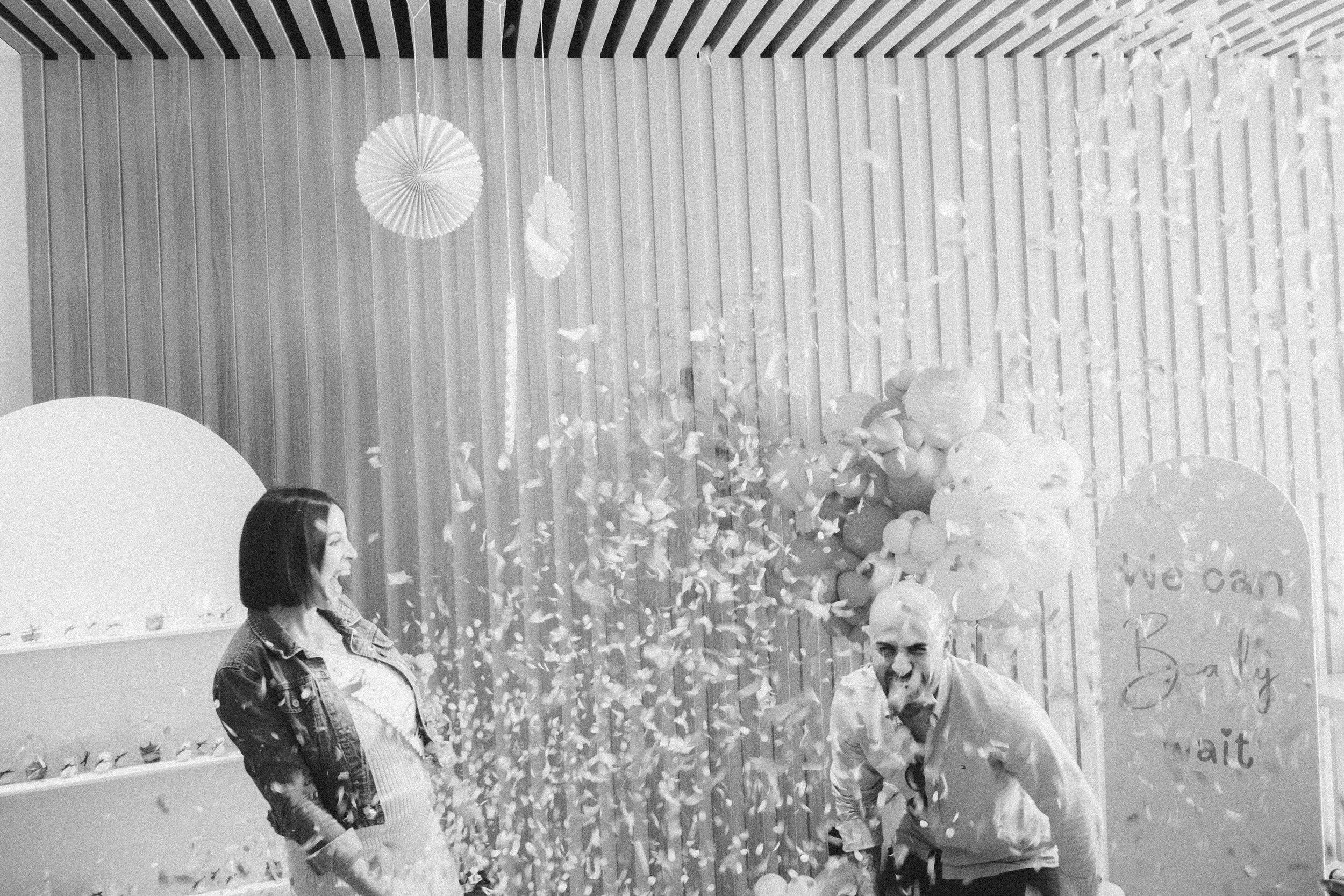 Two people celebrating, one woman and one man, with confetti and balloons in a decorated room with wall decor and a sign that says 'We can be any way we want'.
