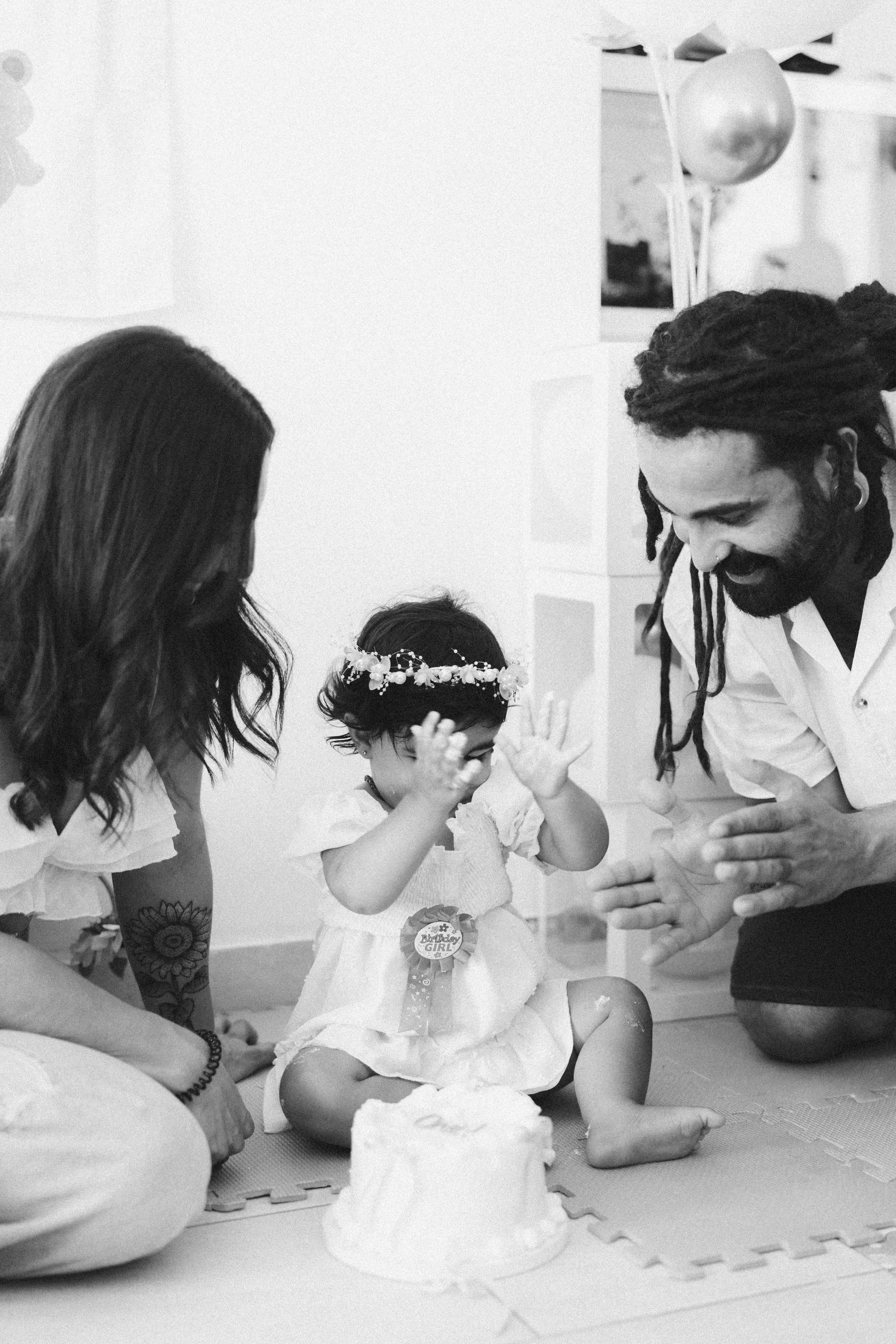 A toddler girl wearing a dress and a floral headband celebrating her birthday with two adults, one woman and one man, sitting on the floor around a birthday cake, in a room decorated with balloons.