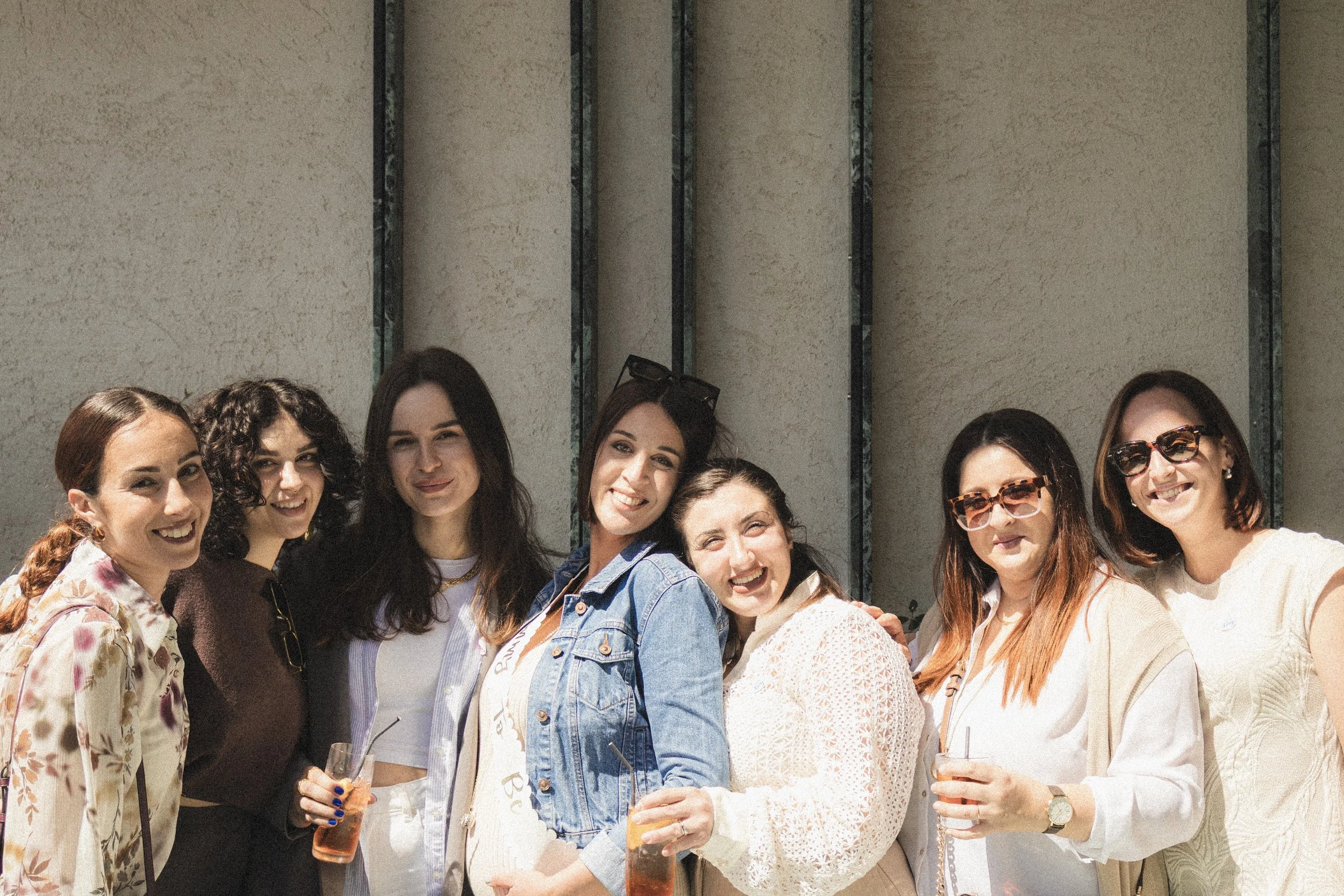 Group of seven women smiling and enjoying drinks outdoors View fullsize