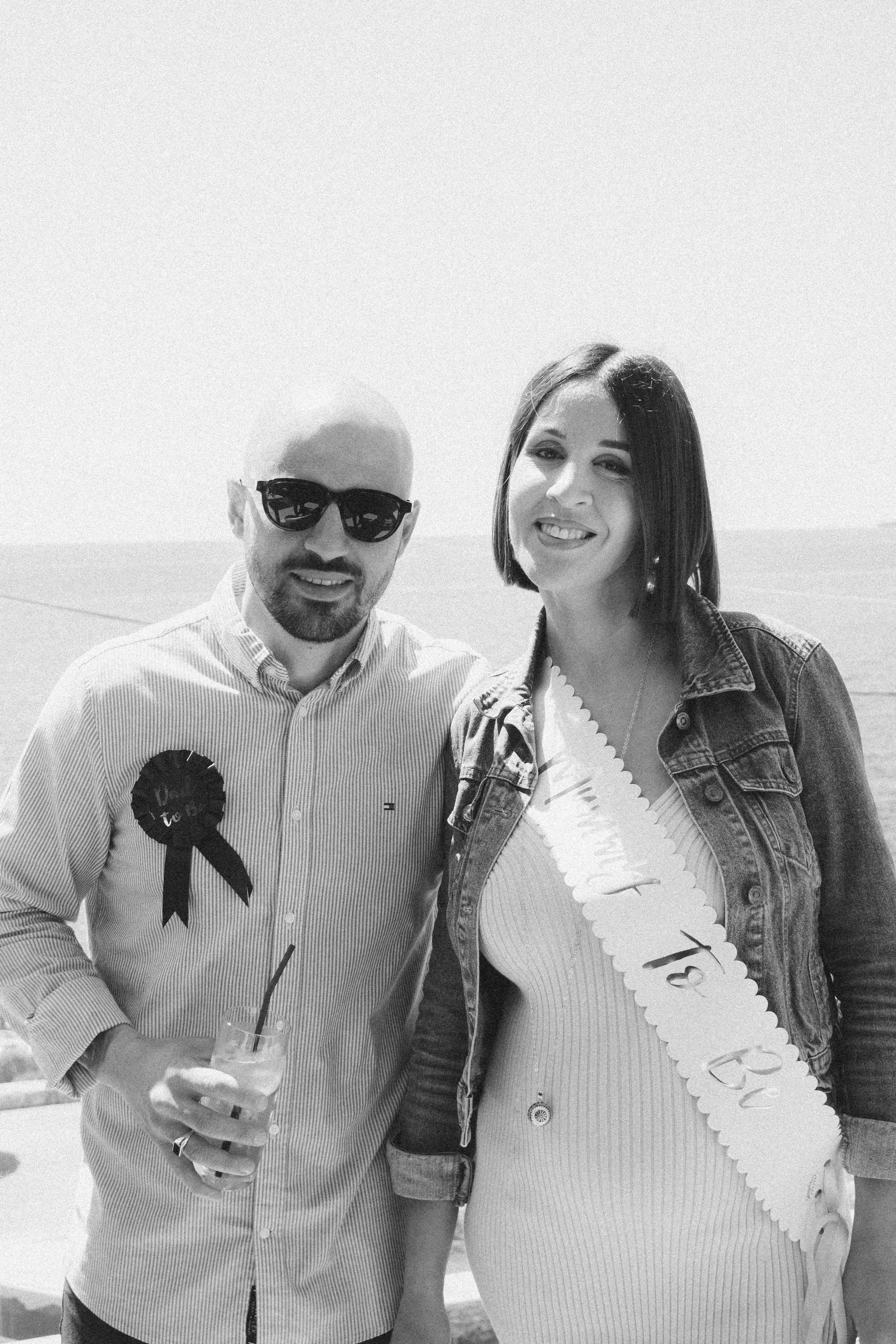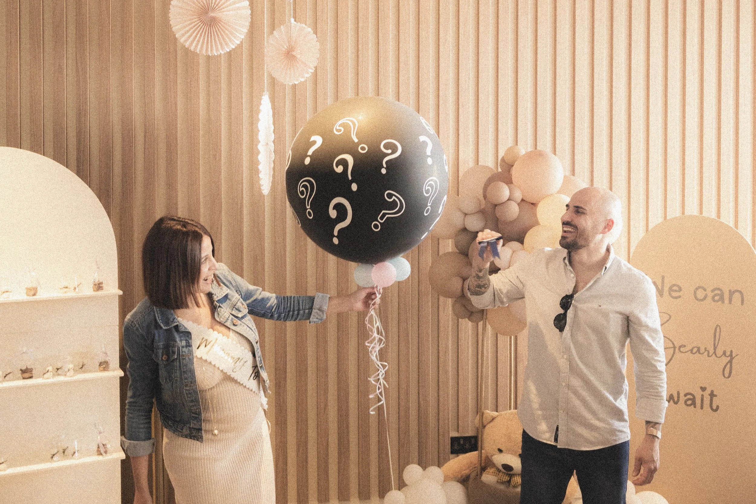 A woman in a denim jacket and a dress with a 'Mommy To Be' sash holds a balloon with question marks on it, while a man in a white shirt with sunglasses hanging from his collar smiles and holds a small object, at a gender reveal party decorated with b