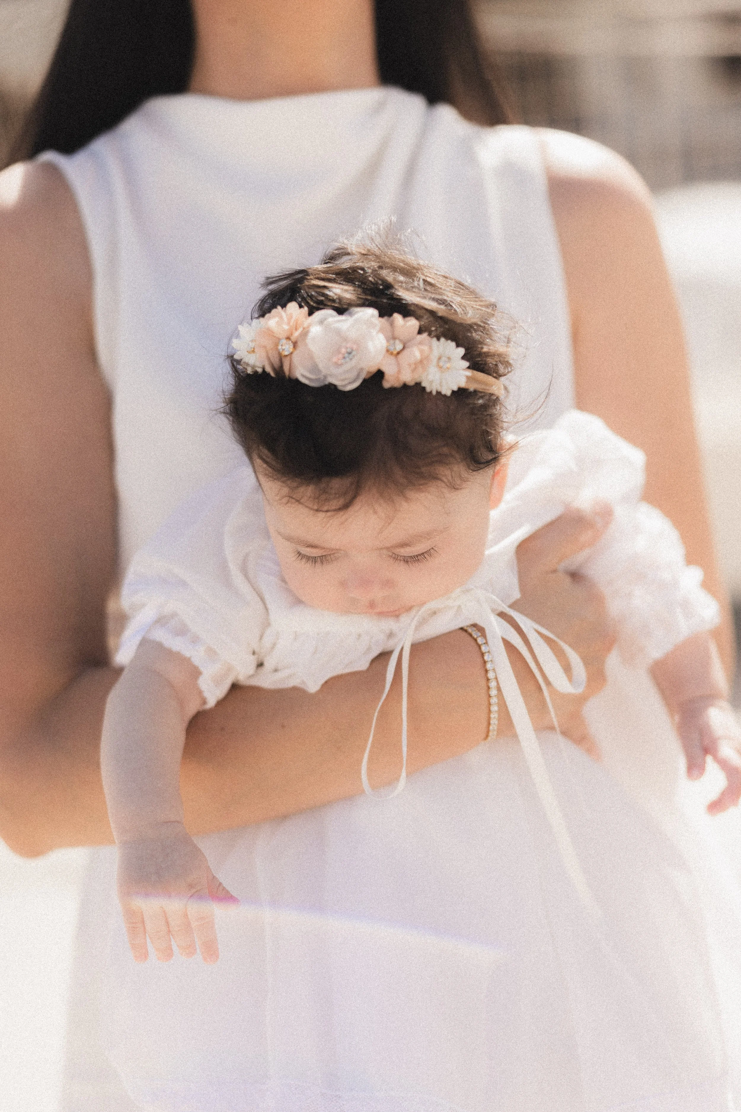 A woman holding a baby dressed in white, with a floral headband, in an outdoor setting.