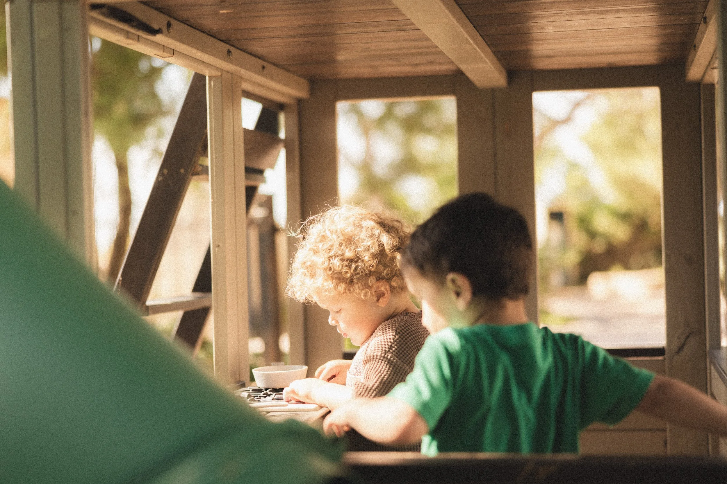 Two children sitting at a small table in a porch, engaged in an activity, with natural light coming through open windows.