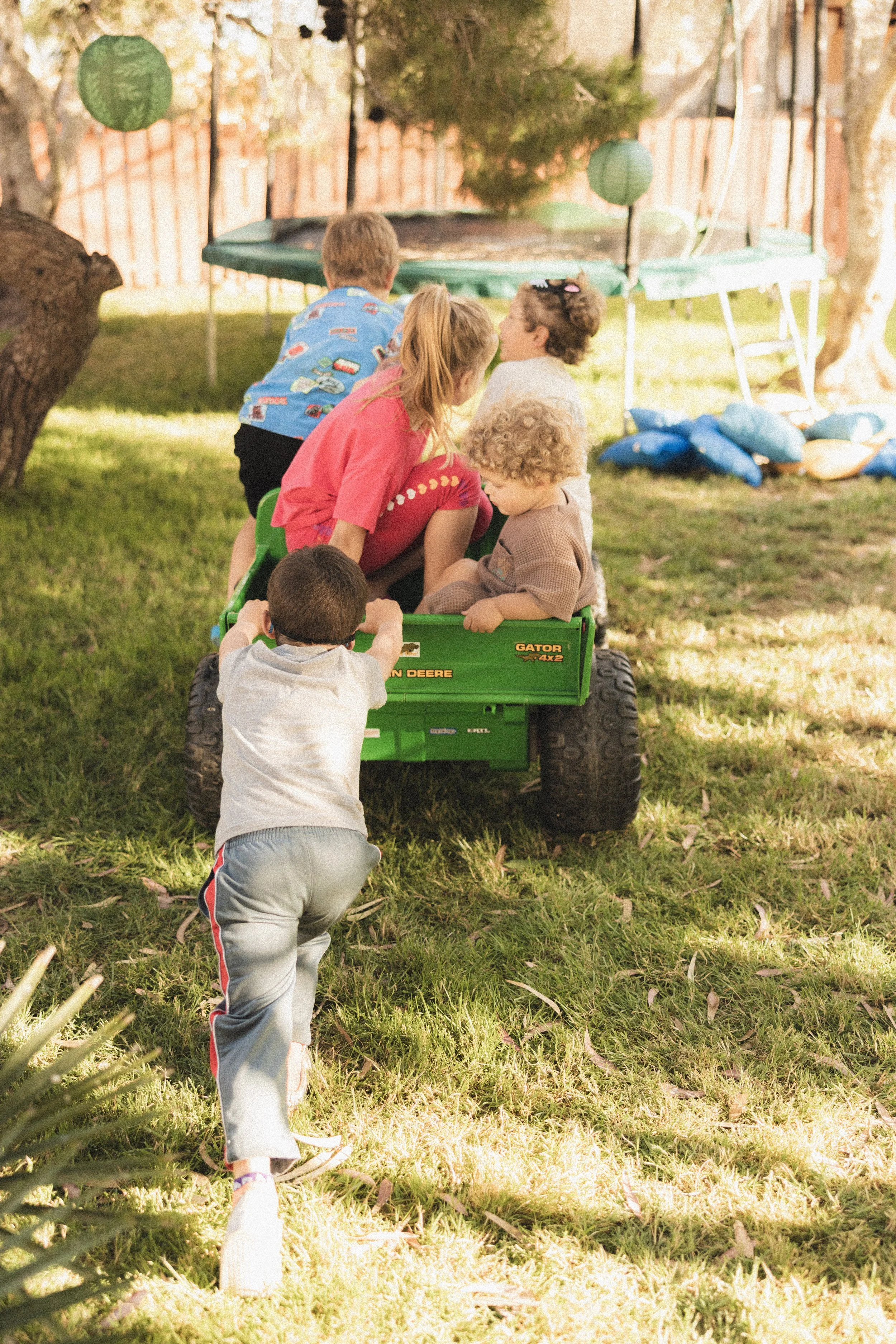 Group of children playing outdoors, with one child pushing a small green toy tractor and others sitting or standing around it.
