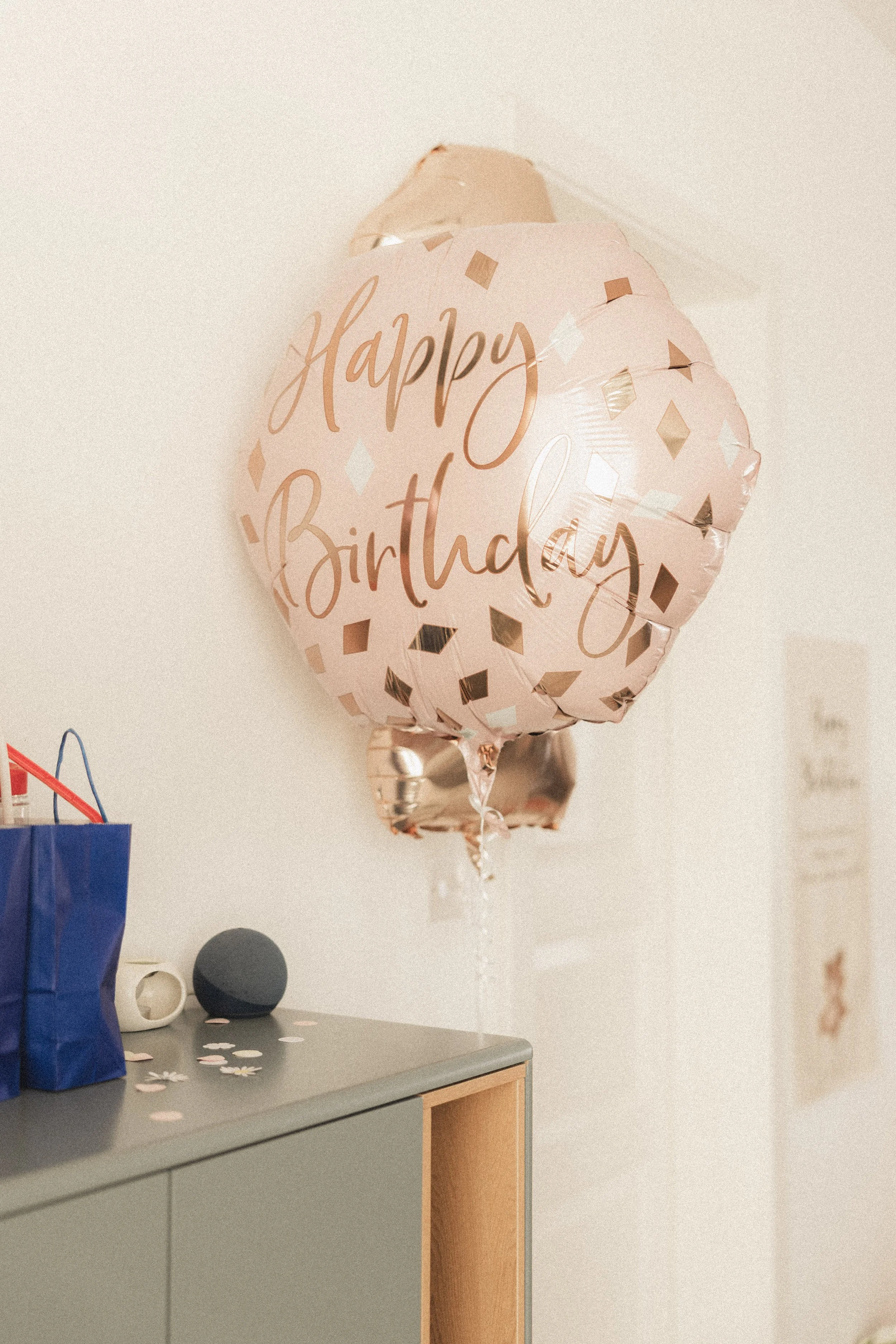 Pink birthday balloon with gold confetti and 'Happy Birthday' written on it, floating near a gray cabinet with scattered paper confetti and a blue gift bag nearby.
