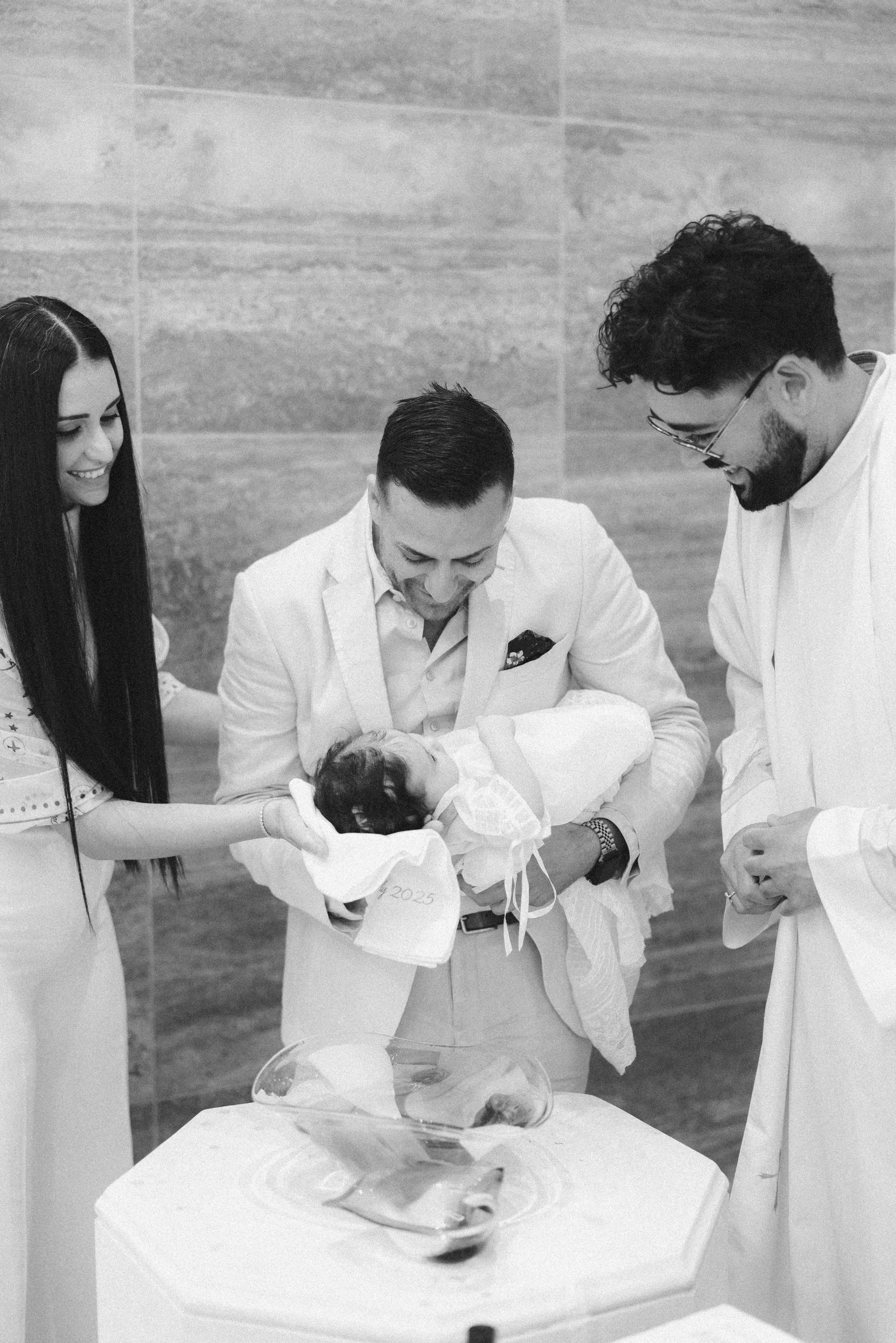 A group of adults at a christening or baptism, holding a newborn baby over a bowl of water, with a priest or officiant present, in a church or religious setting.
