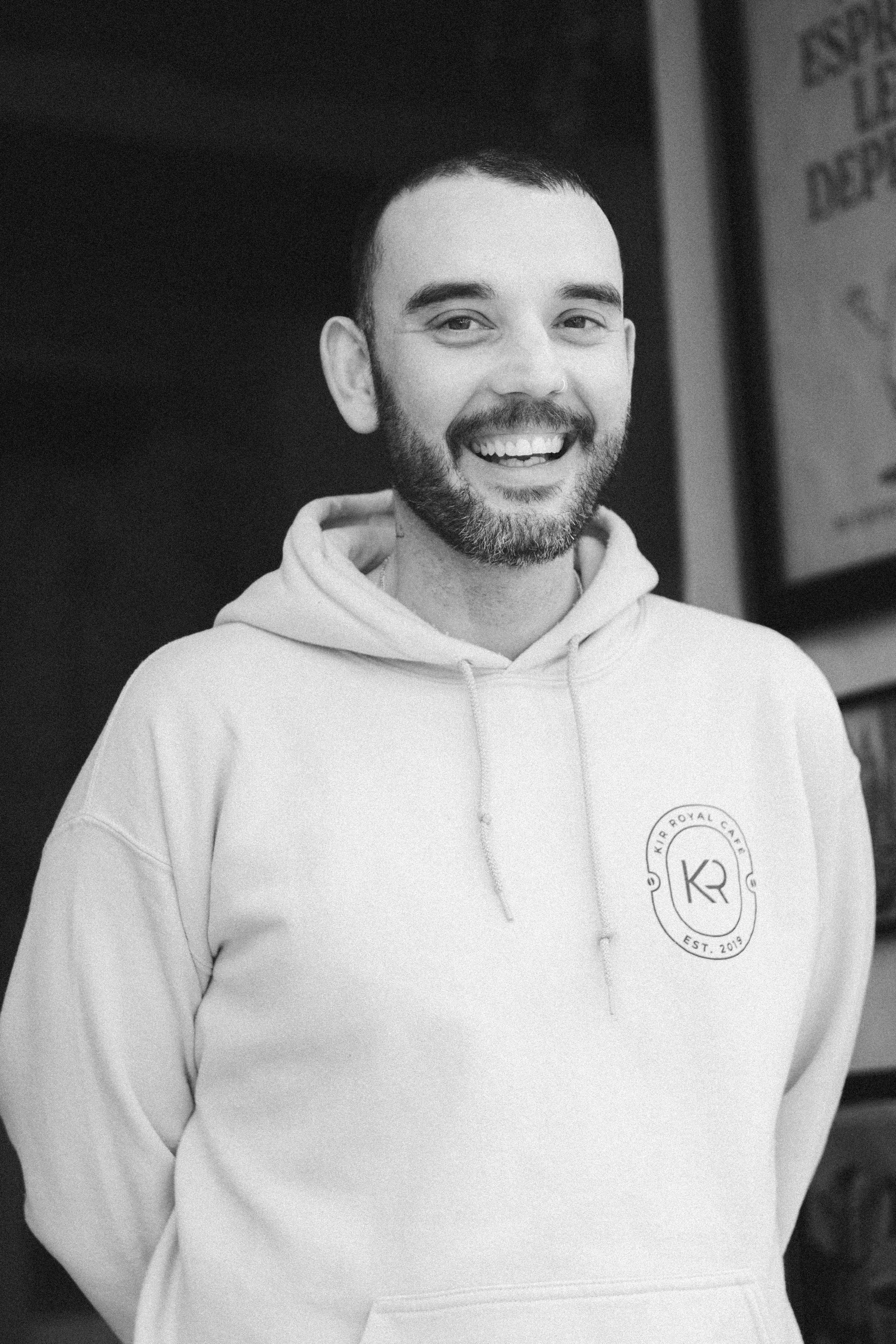 A smiling man with a beard and short hair wearing a light-colored hoodie with a circular logo on the chest. The logo says "Kite Royal Cafe" and