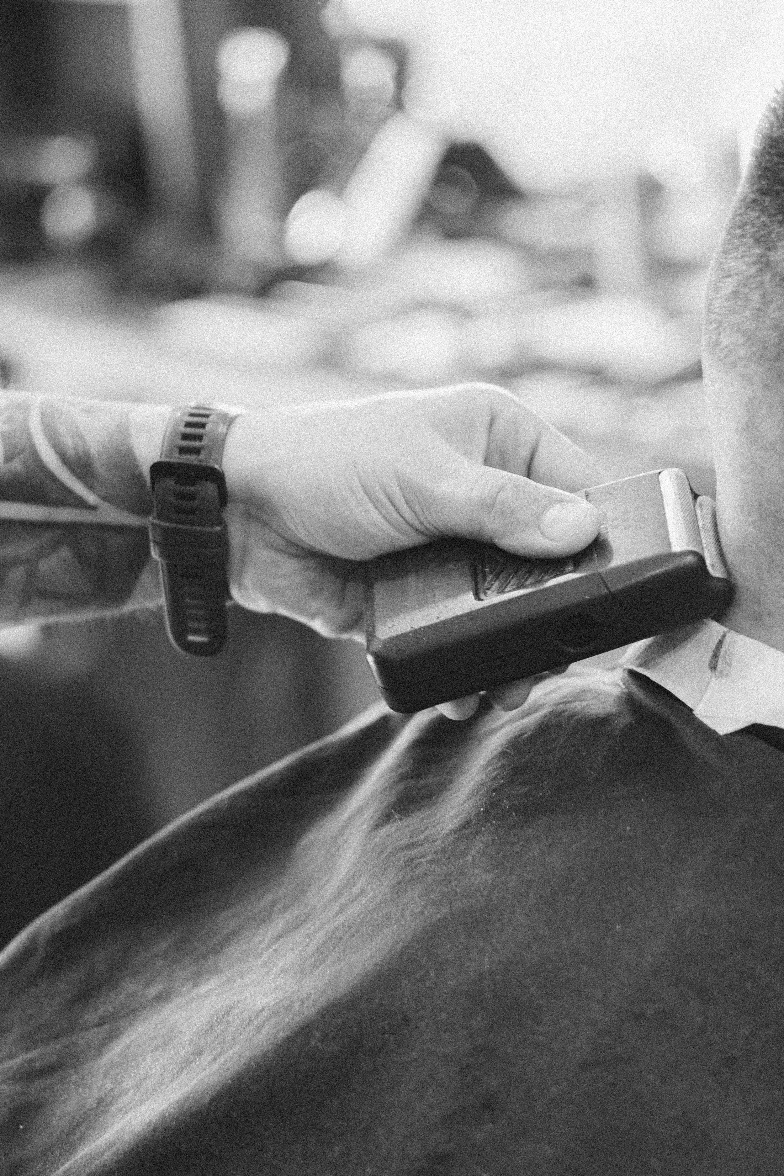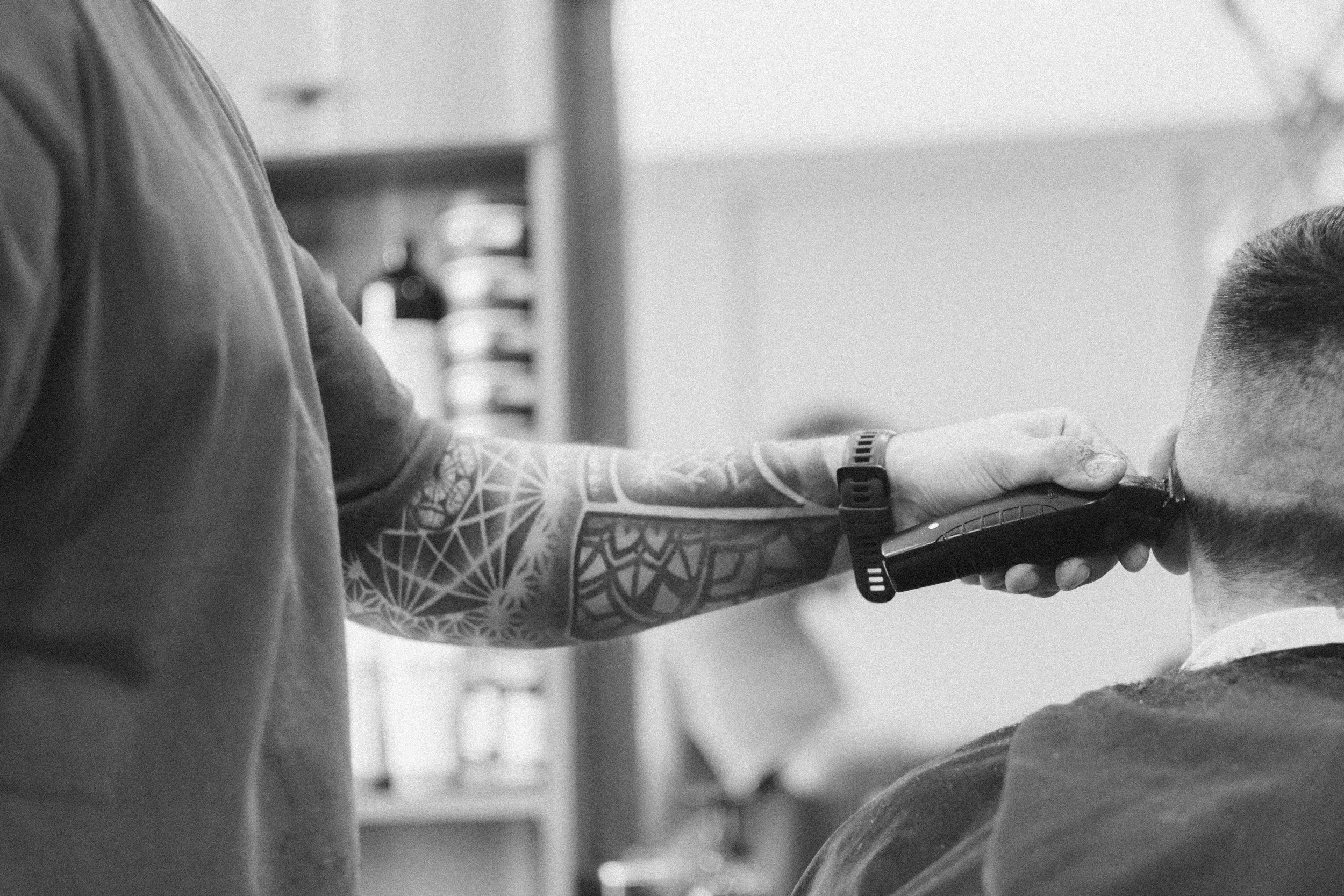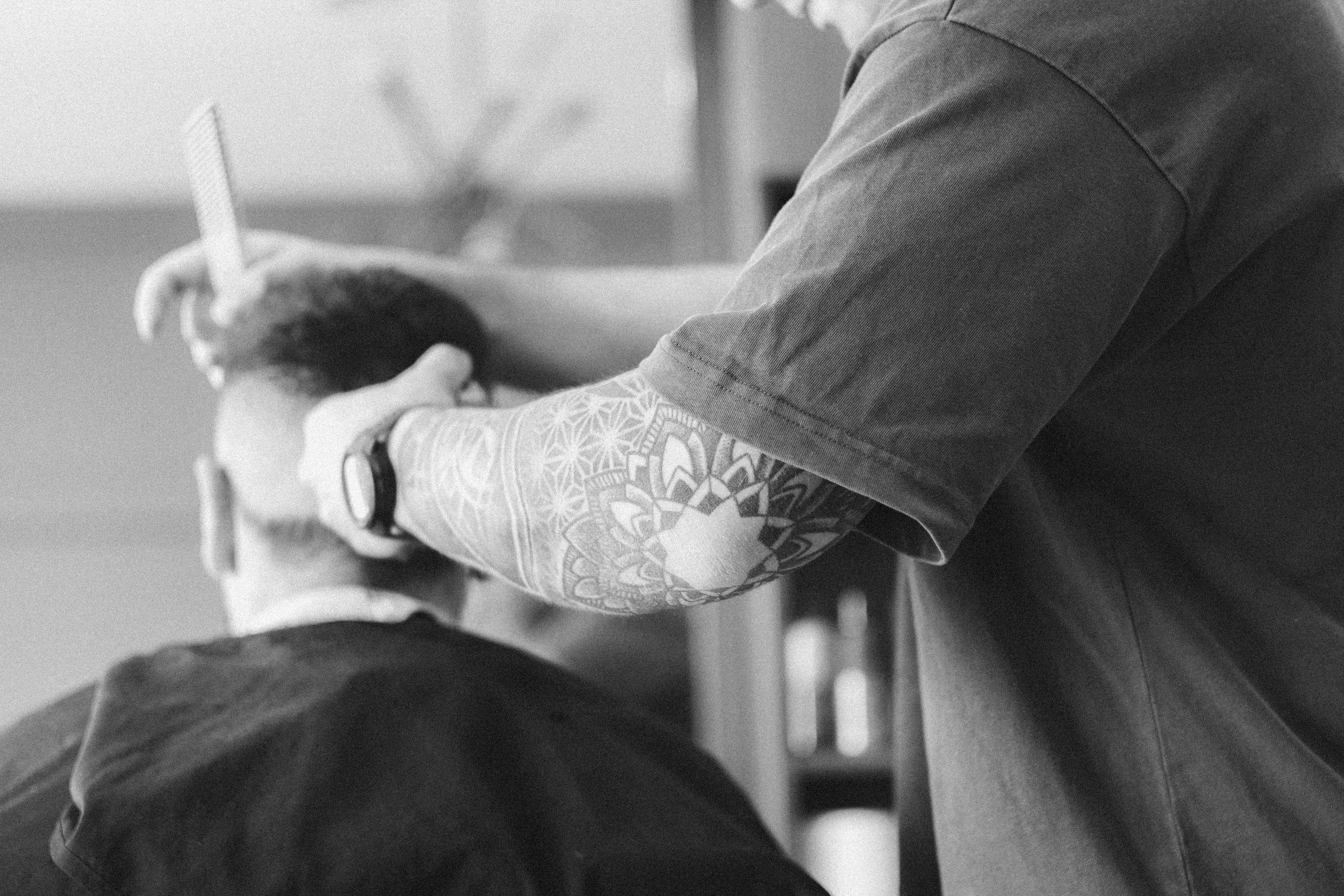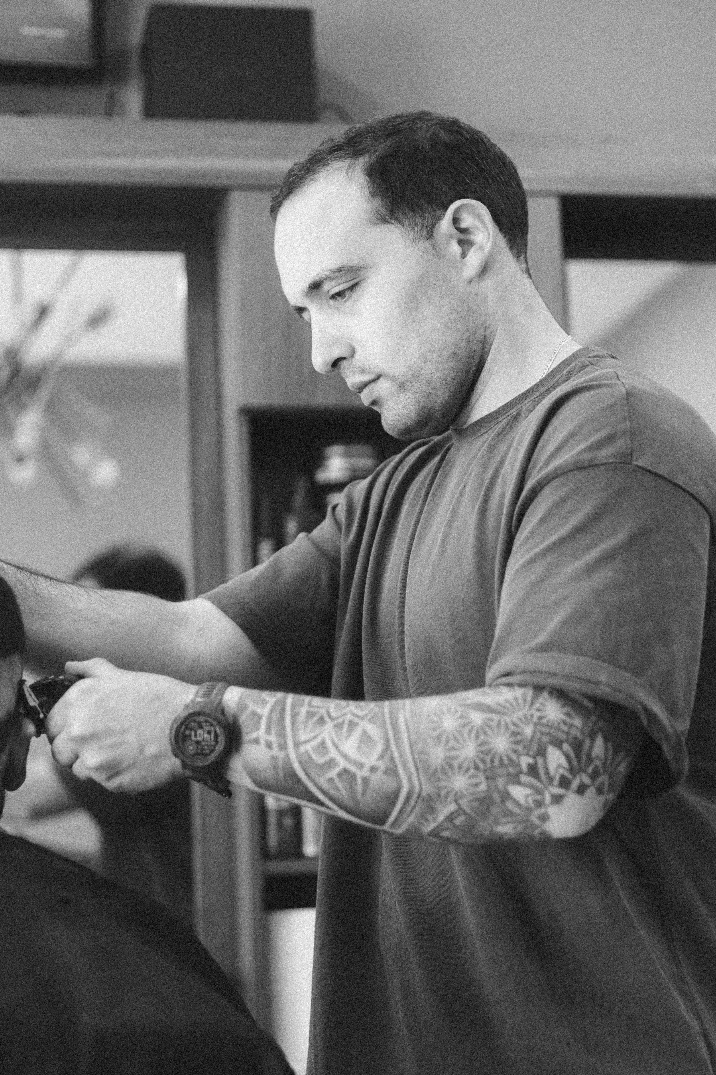 A man with short dark hair and a tattoo sleeve on his left arm is focused on cutting someone's hair in a barbershop. Black and white photo.