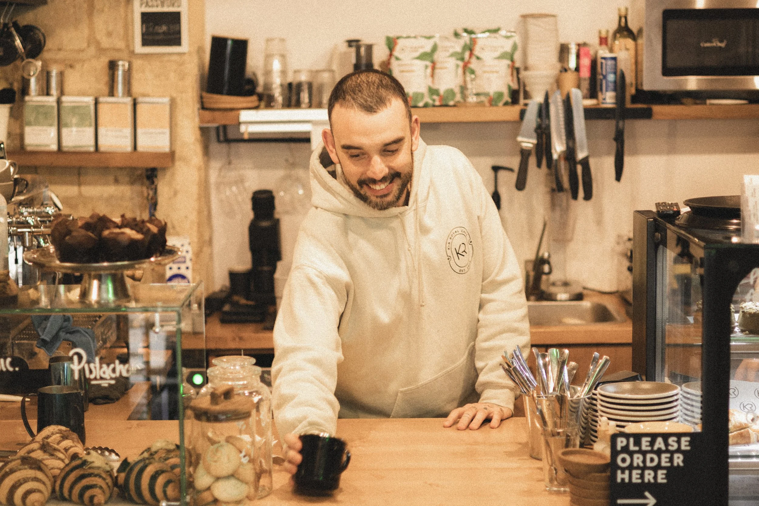 A barista or cashier with a beard and short hair smiling behind a cafe counter, holding a black mug, surrounded by cookies and cafe items.