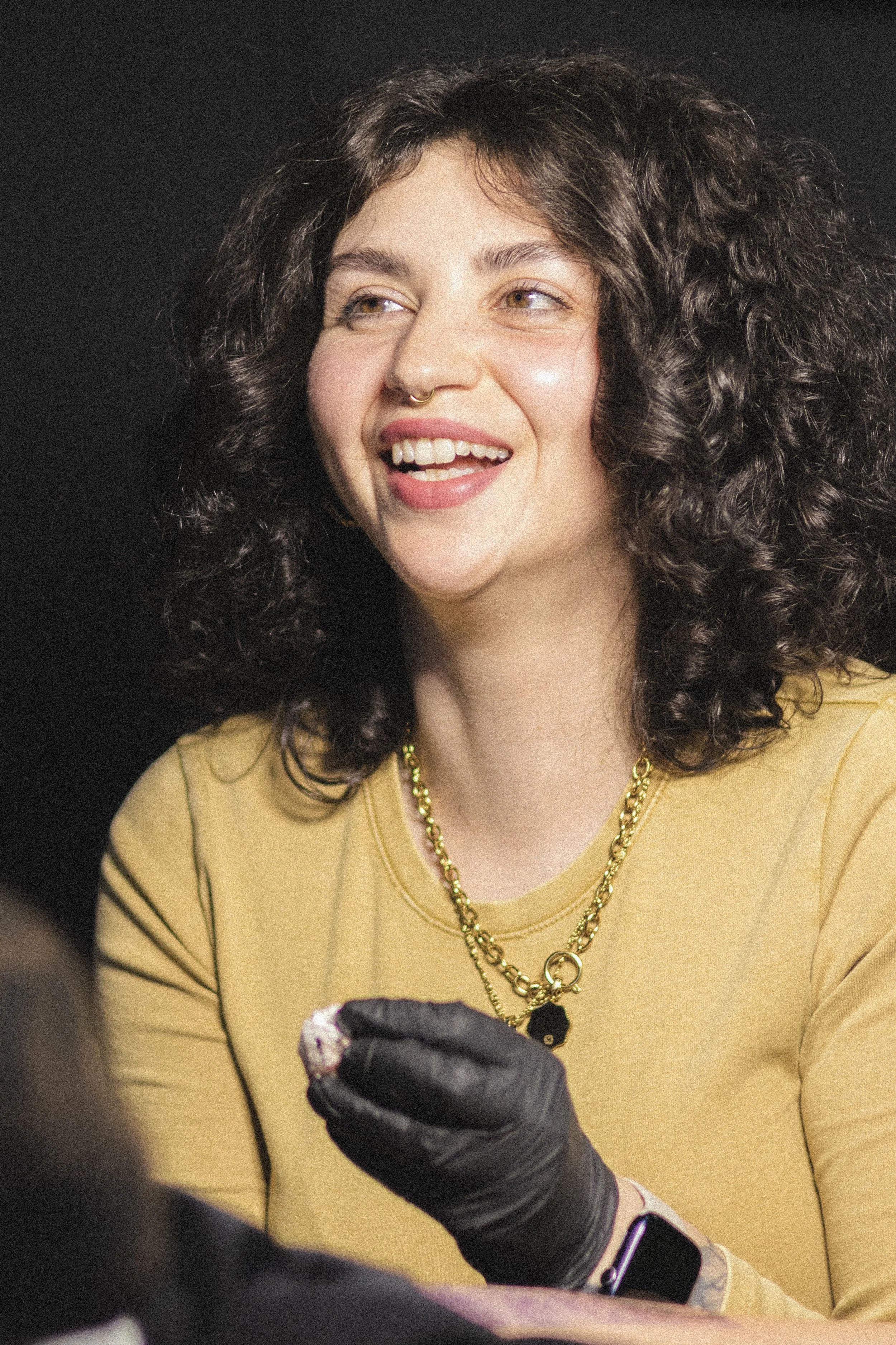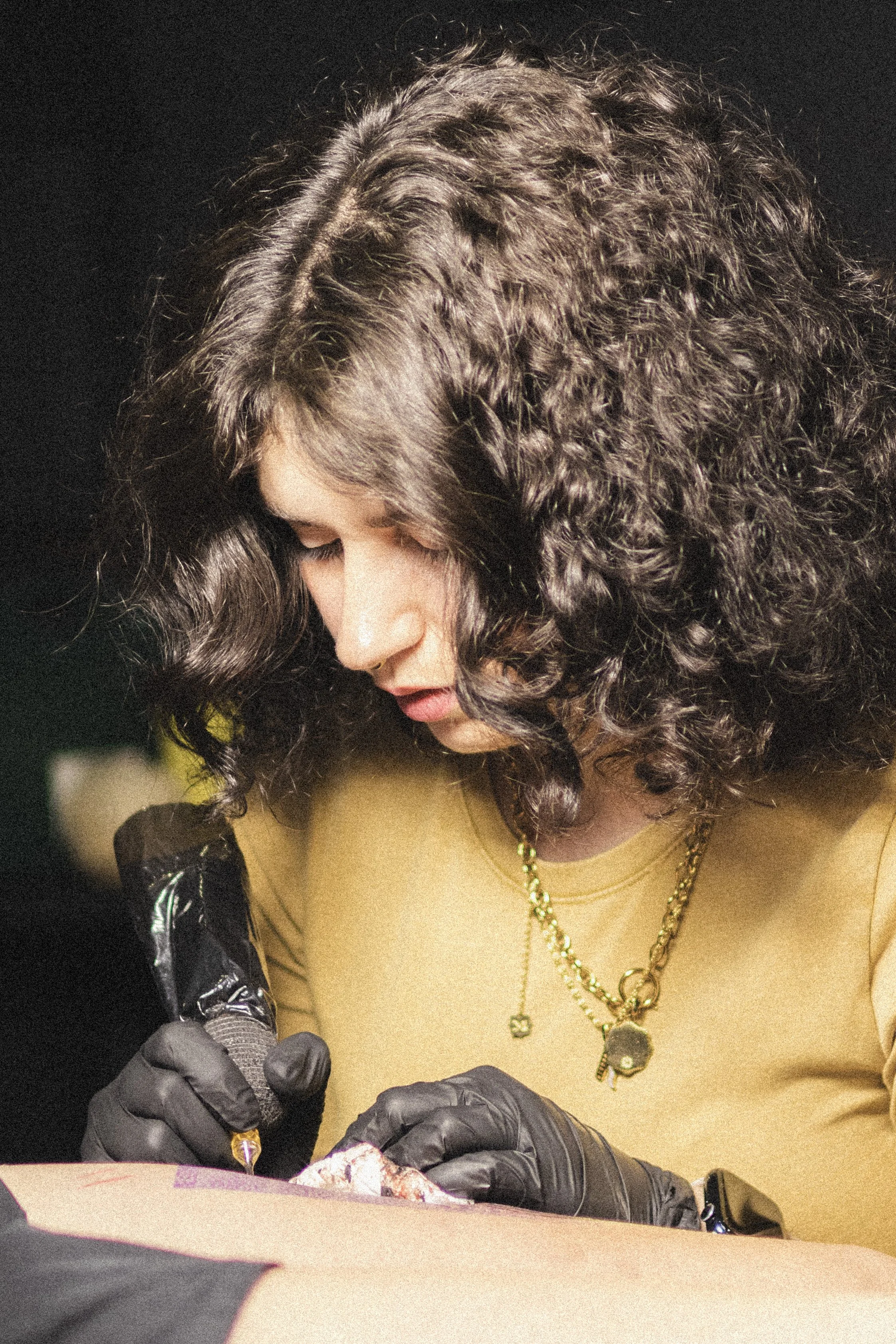 A woman with curly dark hair and wearing a gold necklace is tattooing a client's arm with a tattoo machine. She is wearing black gloves and a gold shirt.