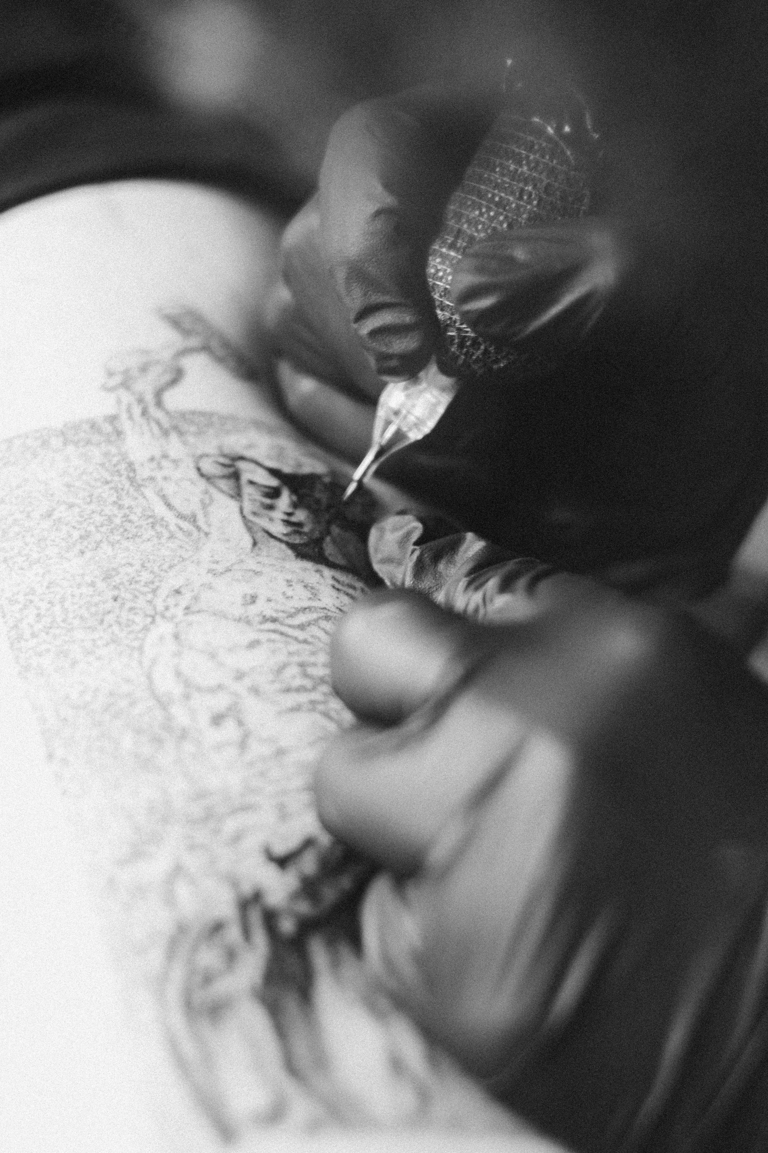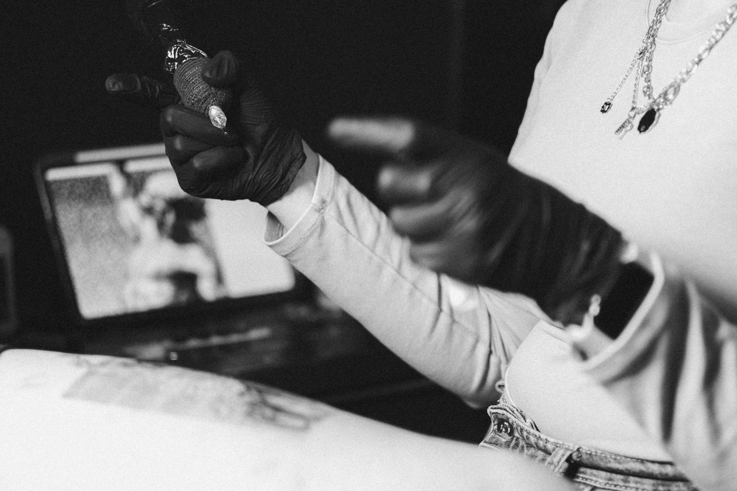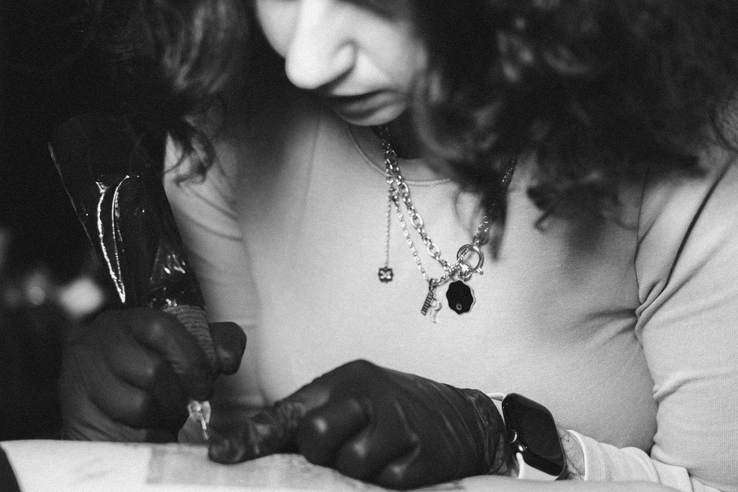 A person wearing black gloves using a tattoo needle on someone's arm, with the tattoo machine in their right hand and the tattooed arm in their left. The person has necklaces and a long-sleeve top.