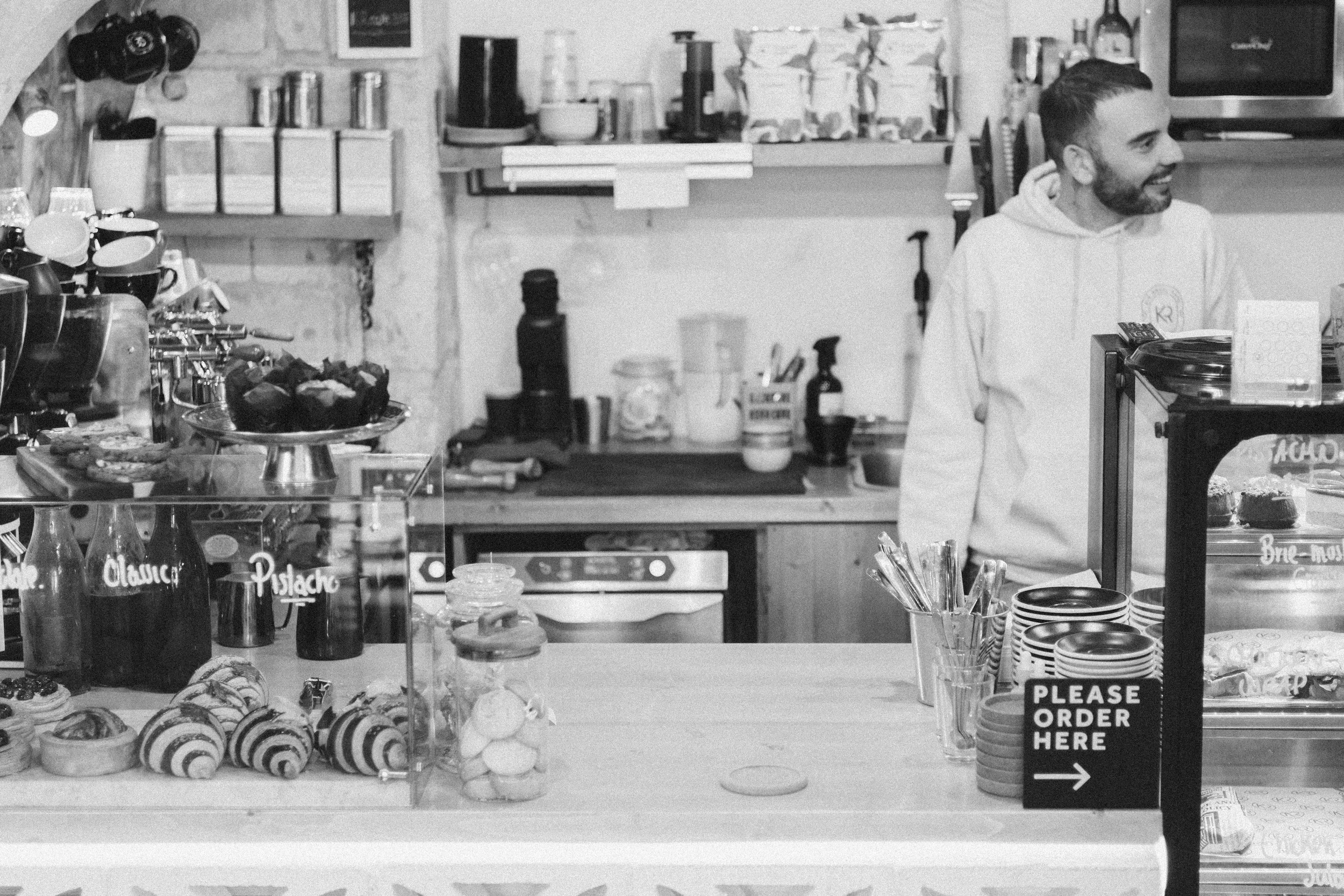 A man in a white hoodie working behind the counter of a bakery or cafe, with pastries and desserts on display, and a sign that says "Please Order Here".