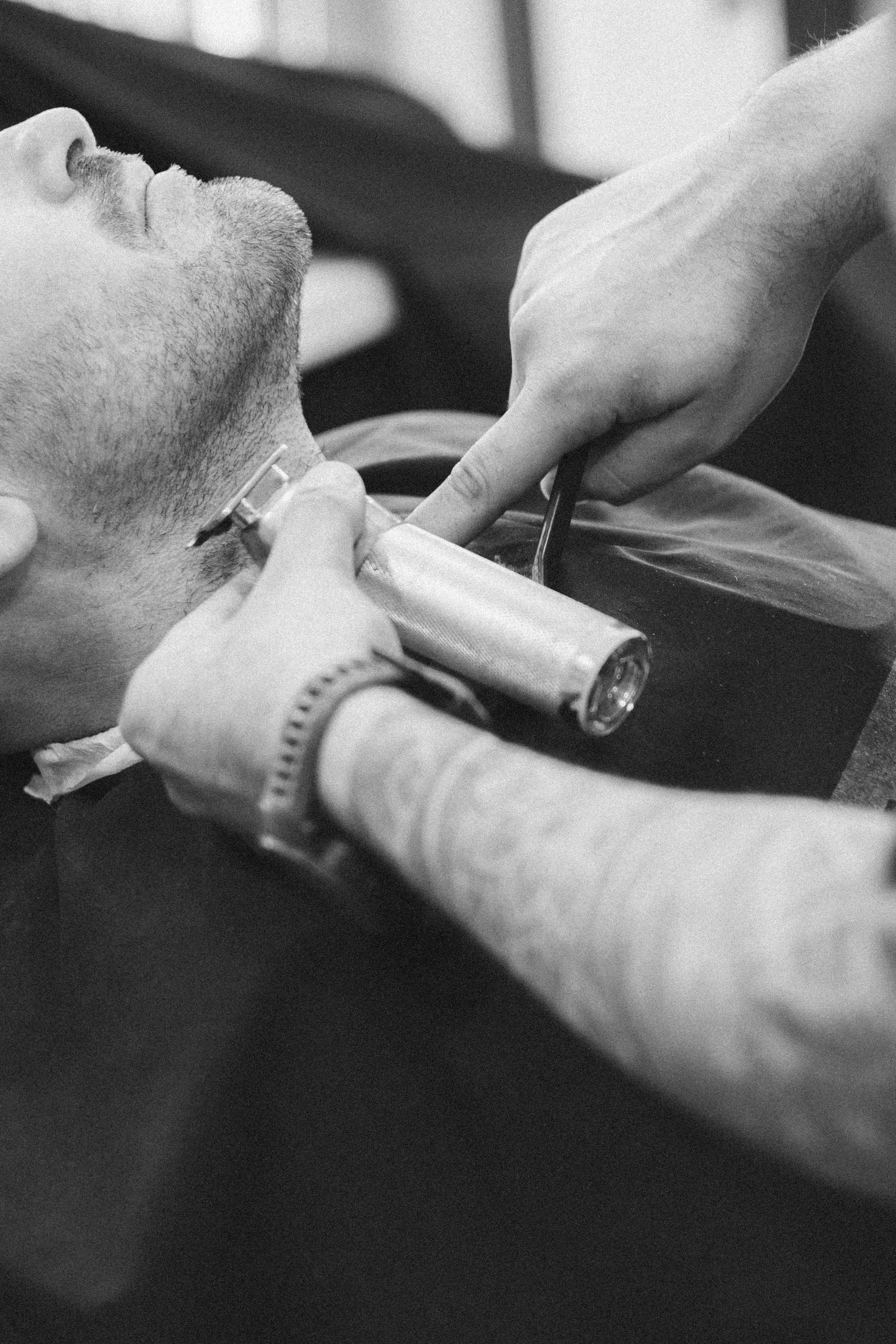 Black and white photo of a barber using a straight razor to shave a man's neck.