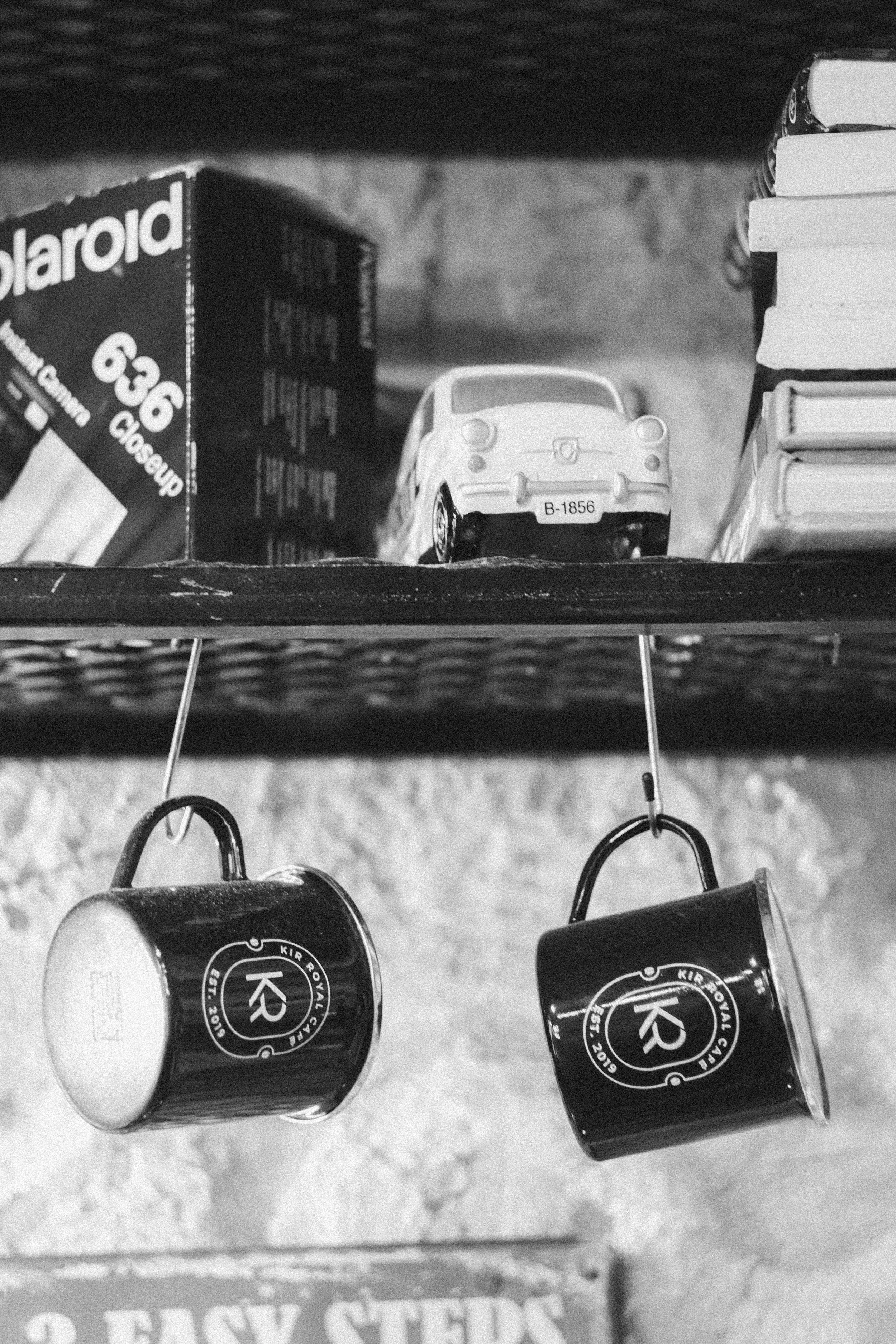A black and white photo of a shelf with a toy car, a box of Clorox disinfecting wipes, and a stack of books. Two coffee mugs with the Kir Royal Cavall logo are hanging from hooks beneath the shelf. View fullsize
