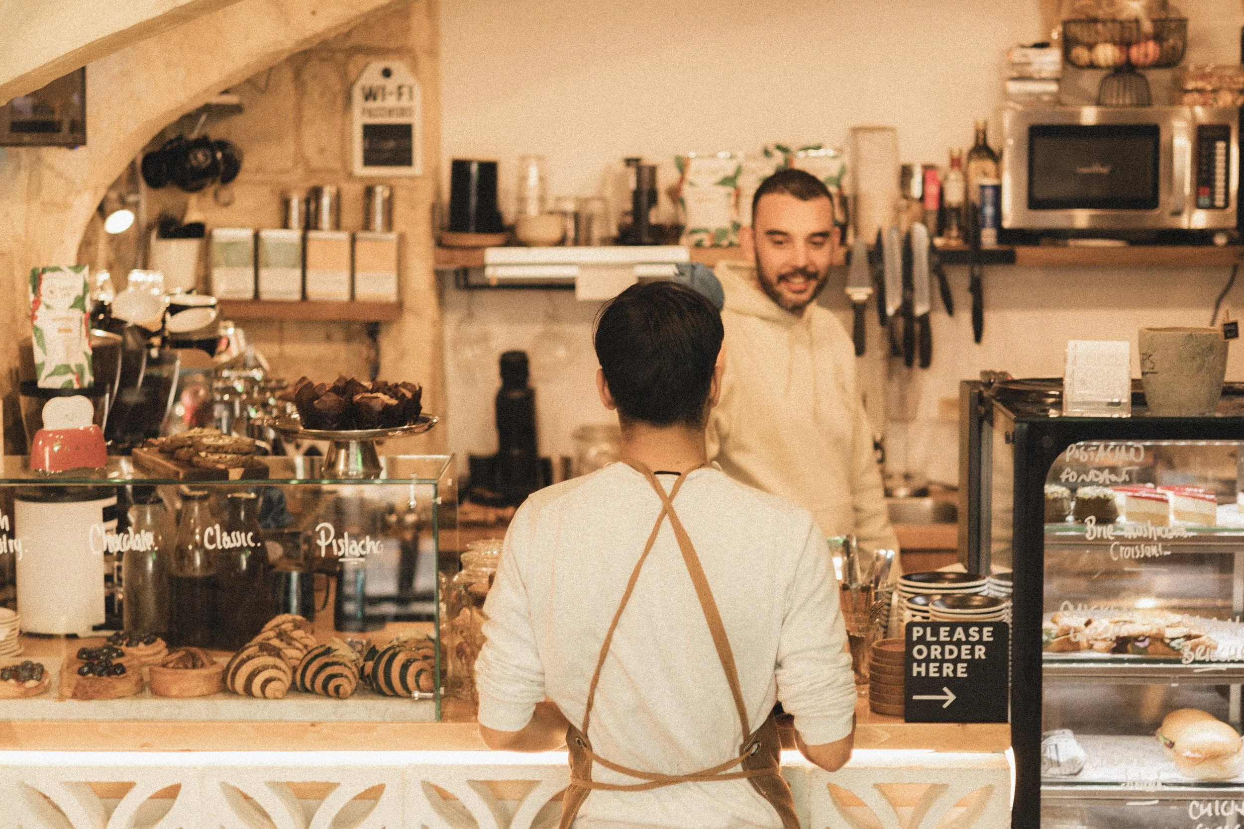 A woman in a white sweater and apron stands at a bakery counter, talking to a smiling man behind the display case in a cozy cafe or bakery.