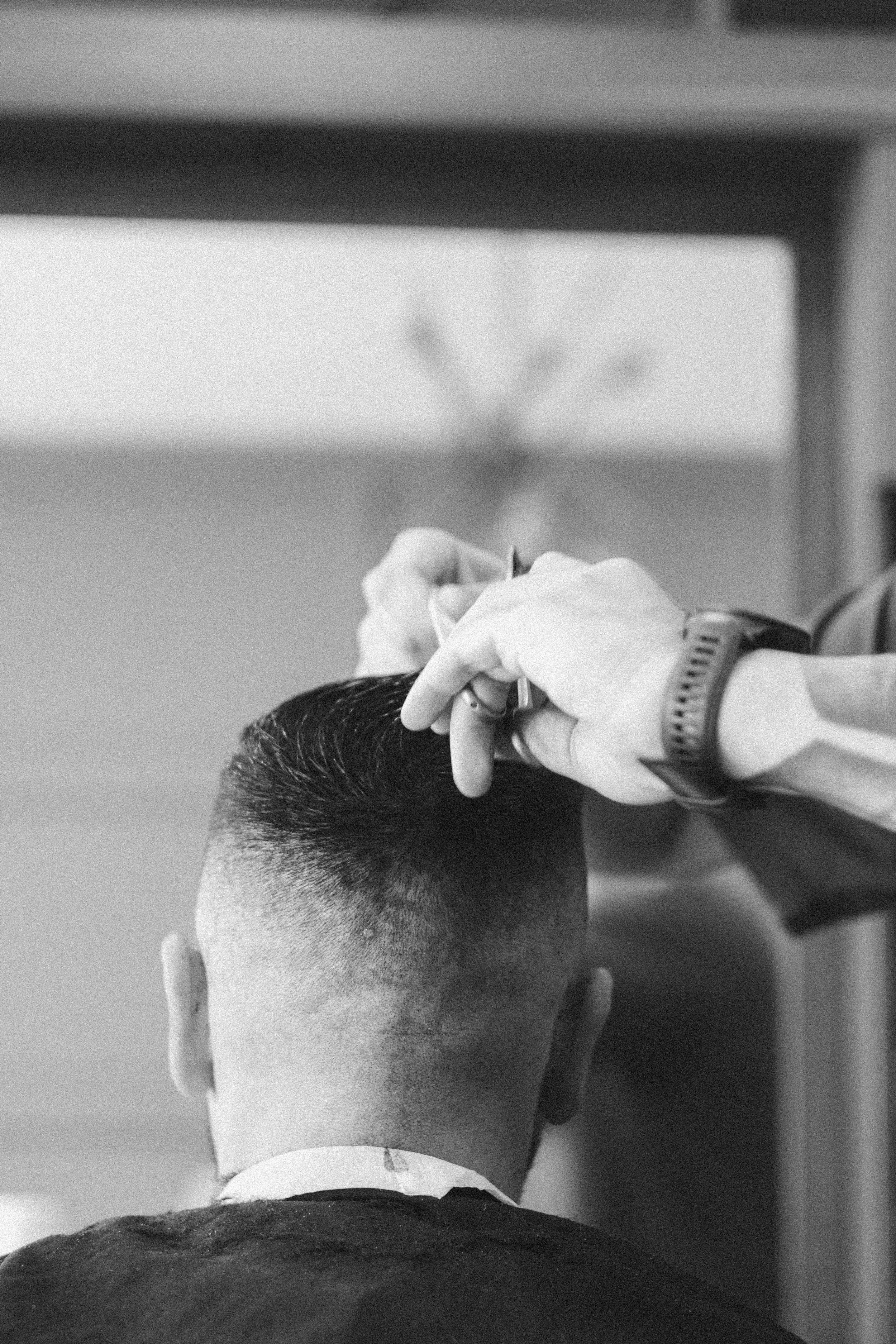 Barber giving a haircut to a client in a salon, seen from behind, in black and white.