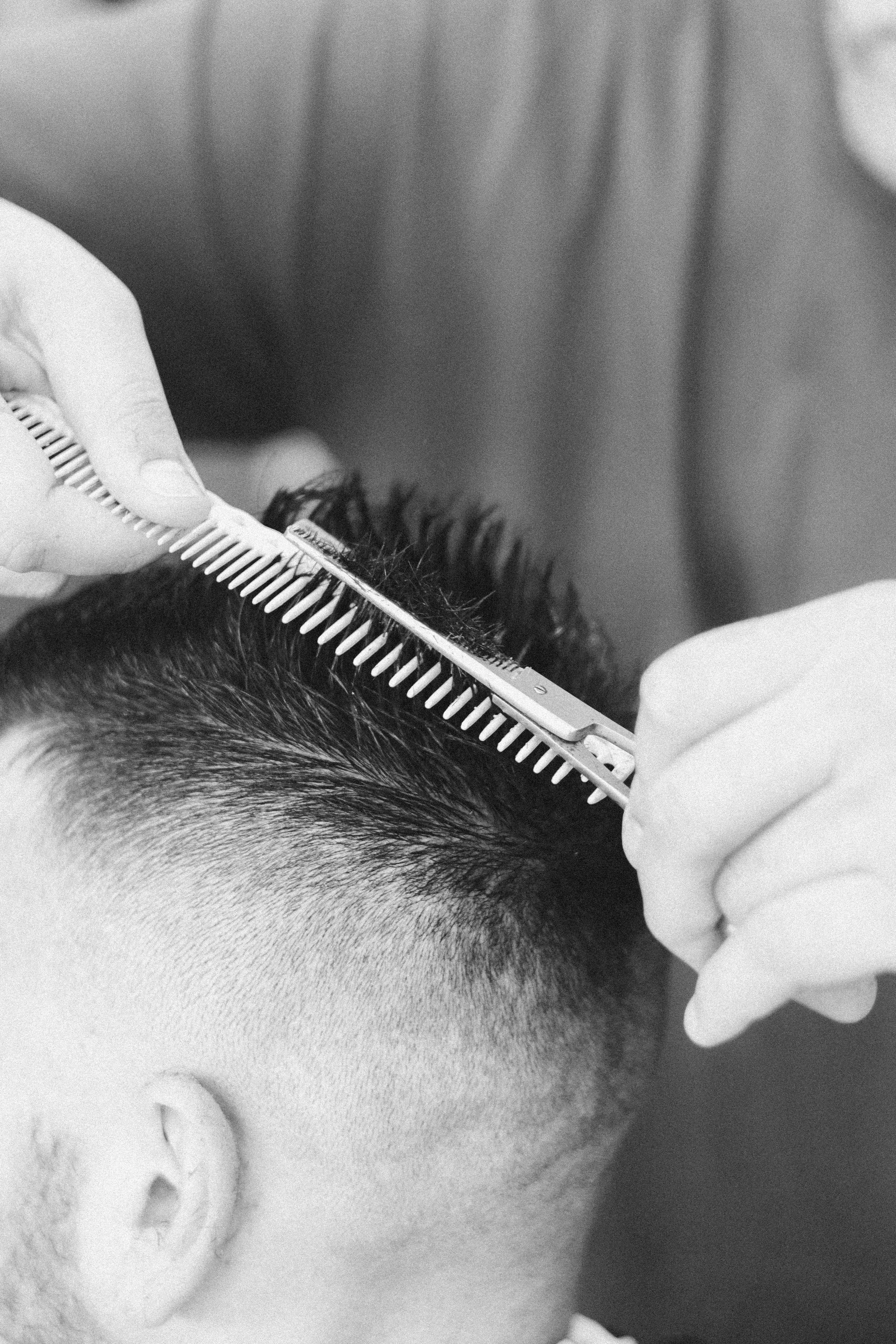 Black and white photo of a barber trimming a man's hair with scissors and a comb.