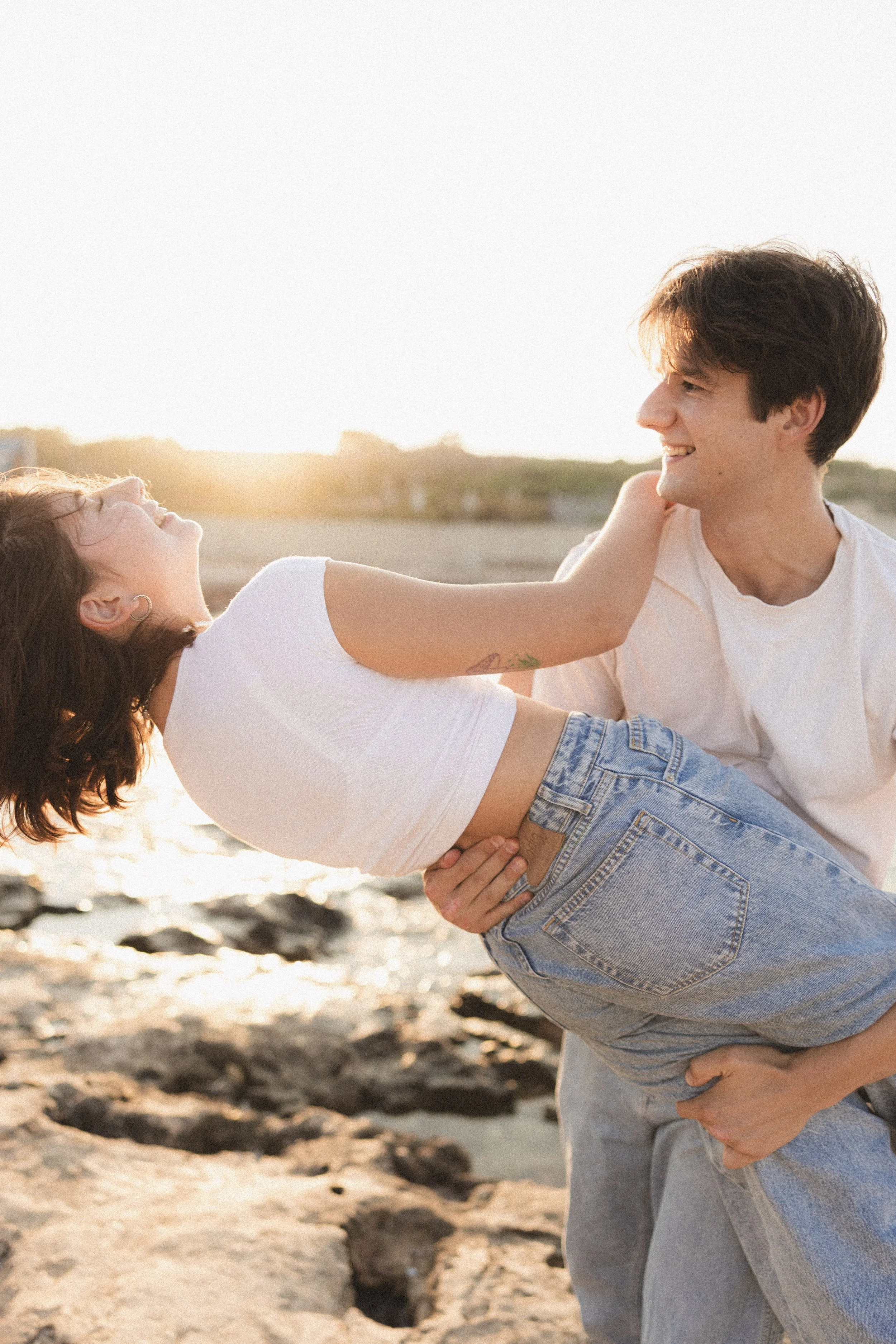 A happy couple at the beach during sunset, with the man holding the woman in a dip, both smiling and enjoying the moment.