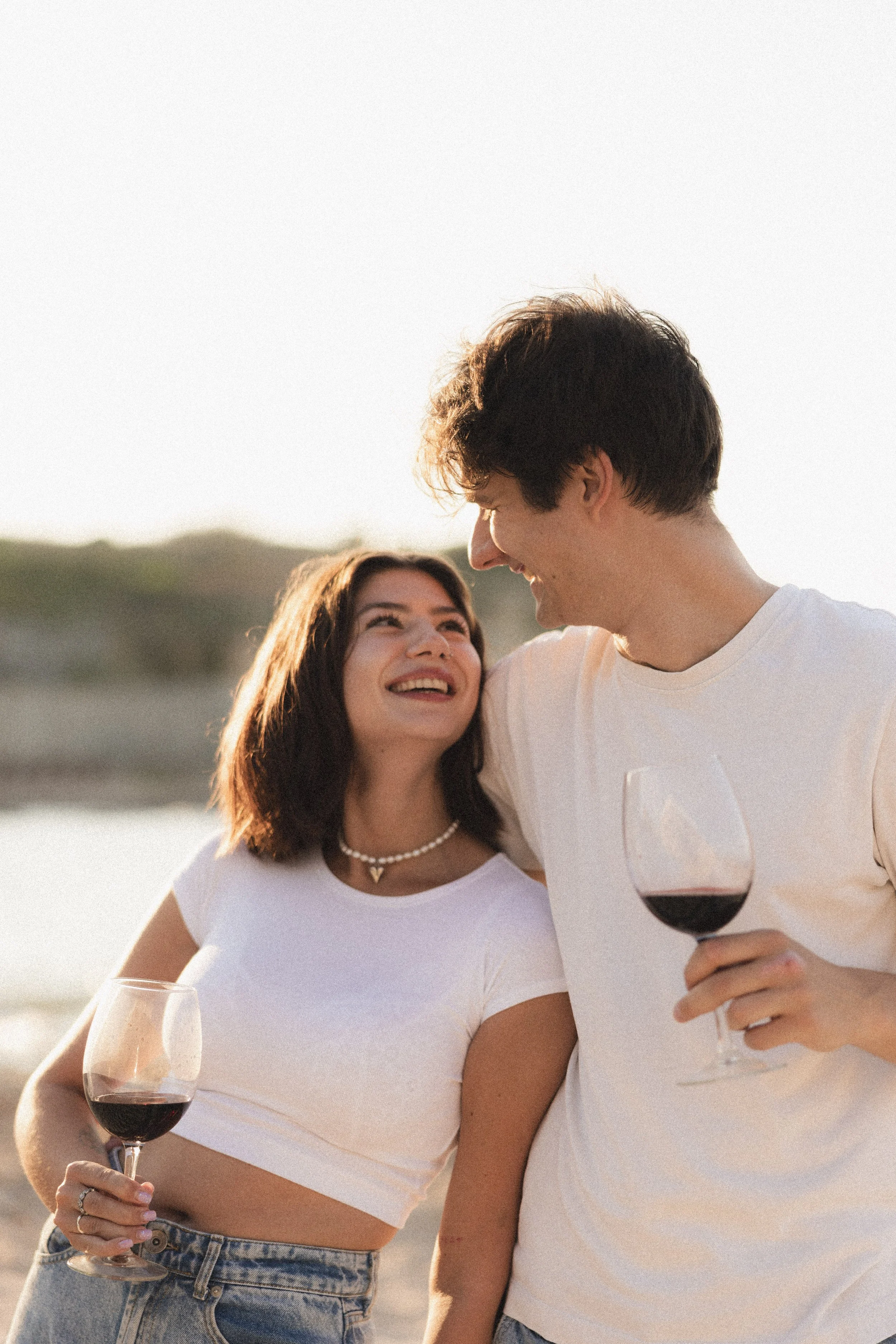 A young couple enjoying wine at the beach at sunset, smiling at each other.