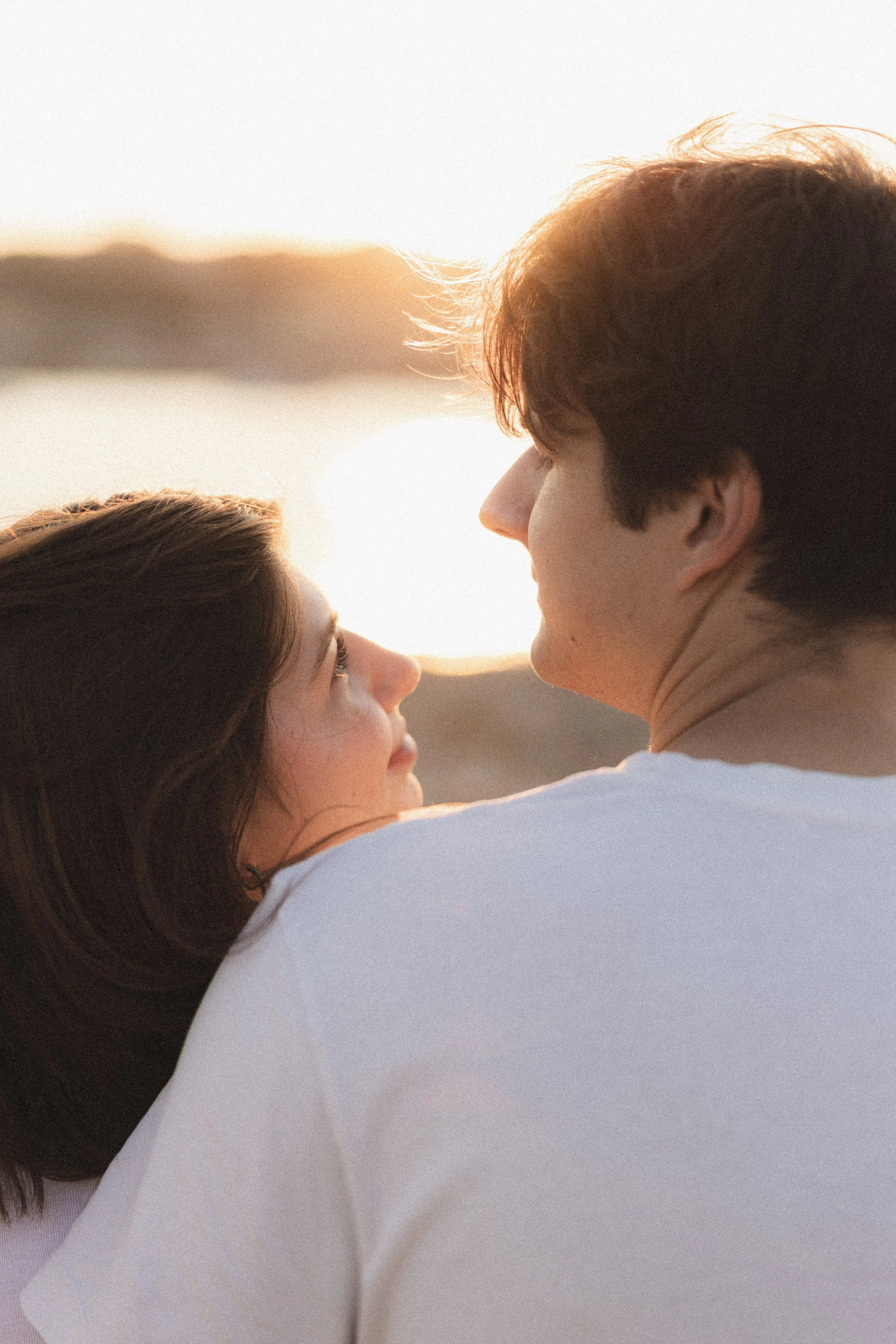 A couple looking at each other during sunset, with water and landscape in the background. View fullsize