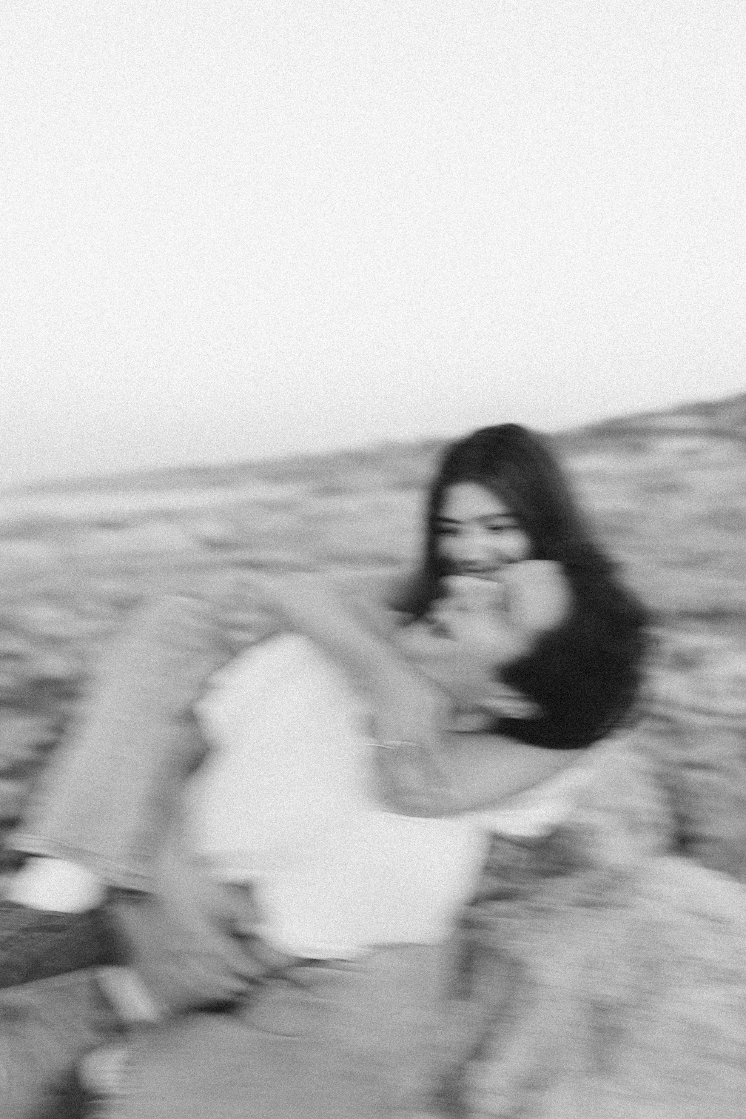 Blurry black-and-white photo of a young woman sitting on a rocky surface outdoors, smiling. She has long dark hair and is wearing a sleeveless top and light-colored pants.
