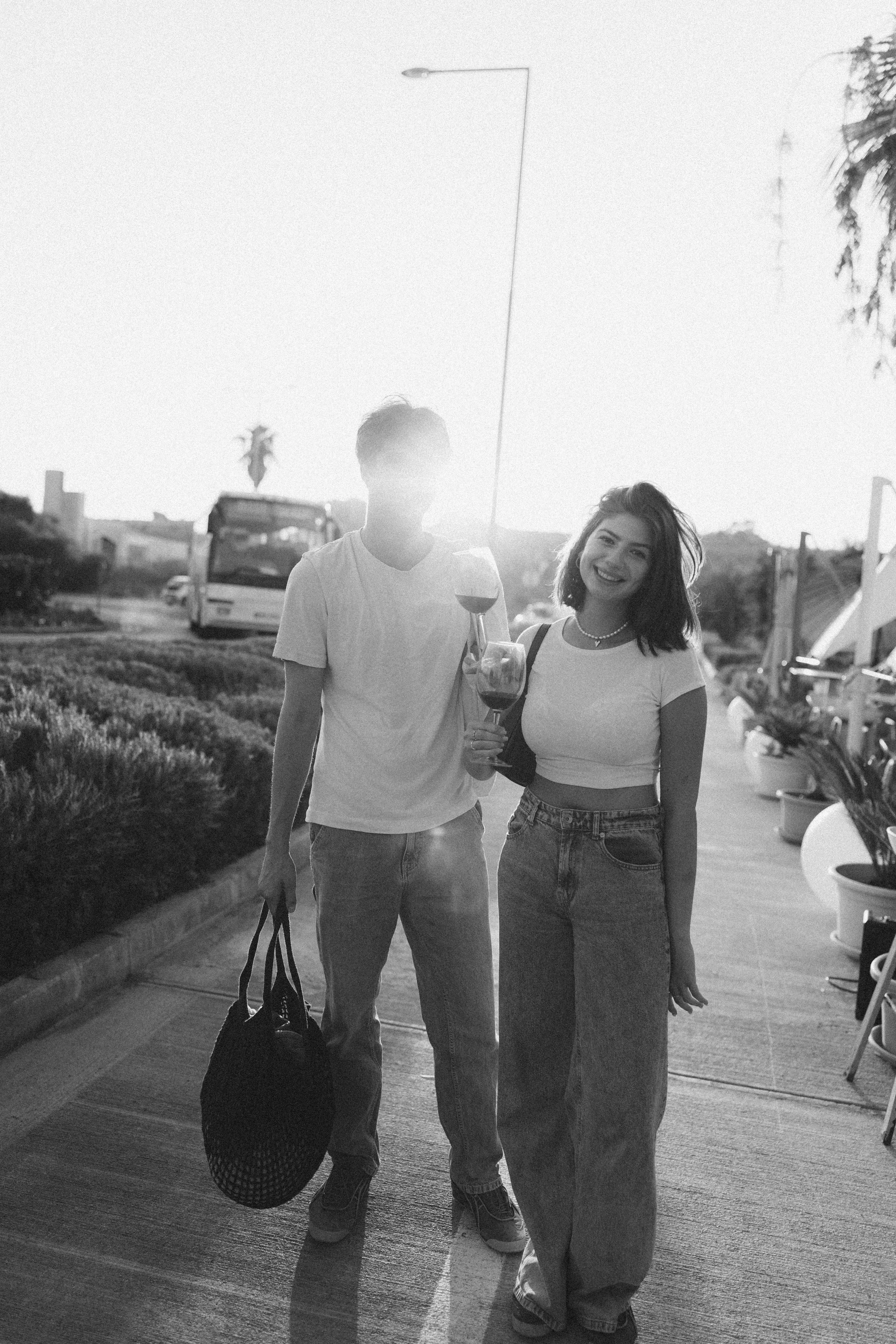 A black and white photo of a young man and woman walking outdoors during sunset, holding glasses of wine; the woman is smiling and looking at the camera while the man walks beside her carrying a bag.
