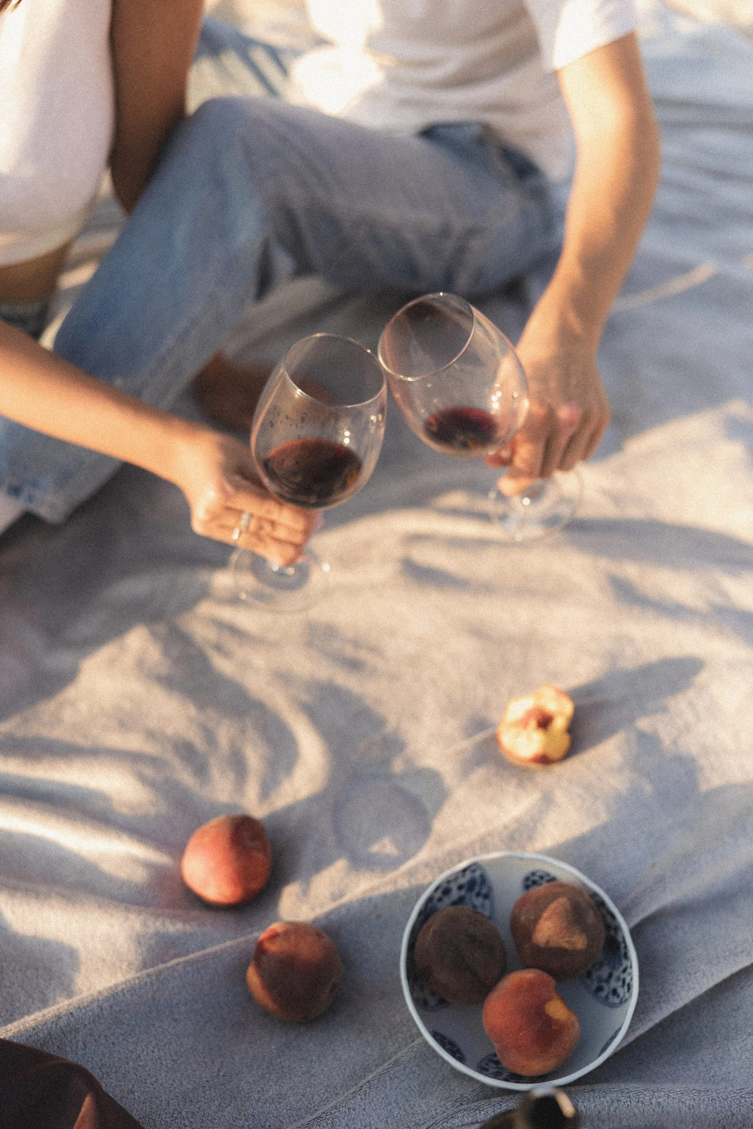 Two people clinking glasses of red wine while sitting on a sandy surface. There are peaches on the sand and in a small bowl nearby.