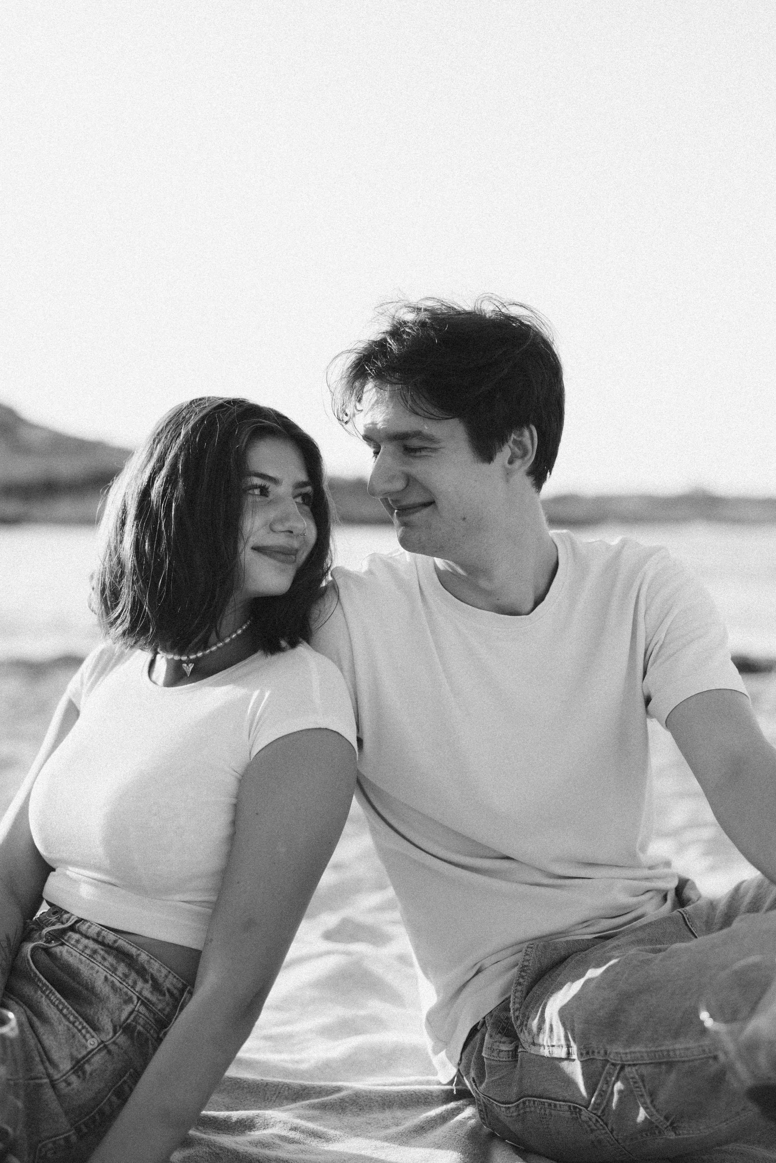 A black and white photograph of a young woman and man sitting on a sandy beach, looking at each other and smiling.